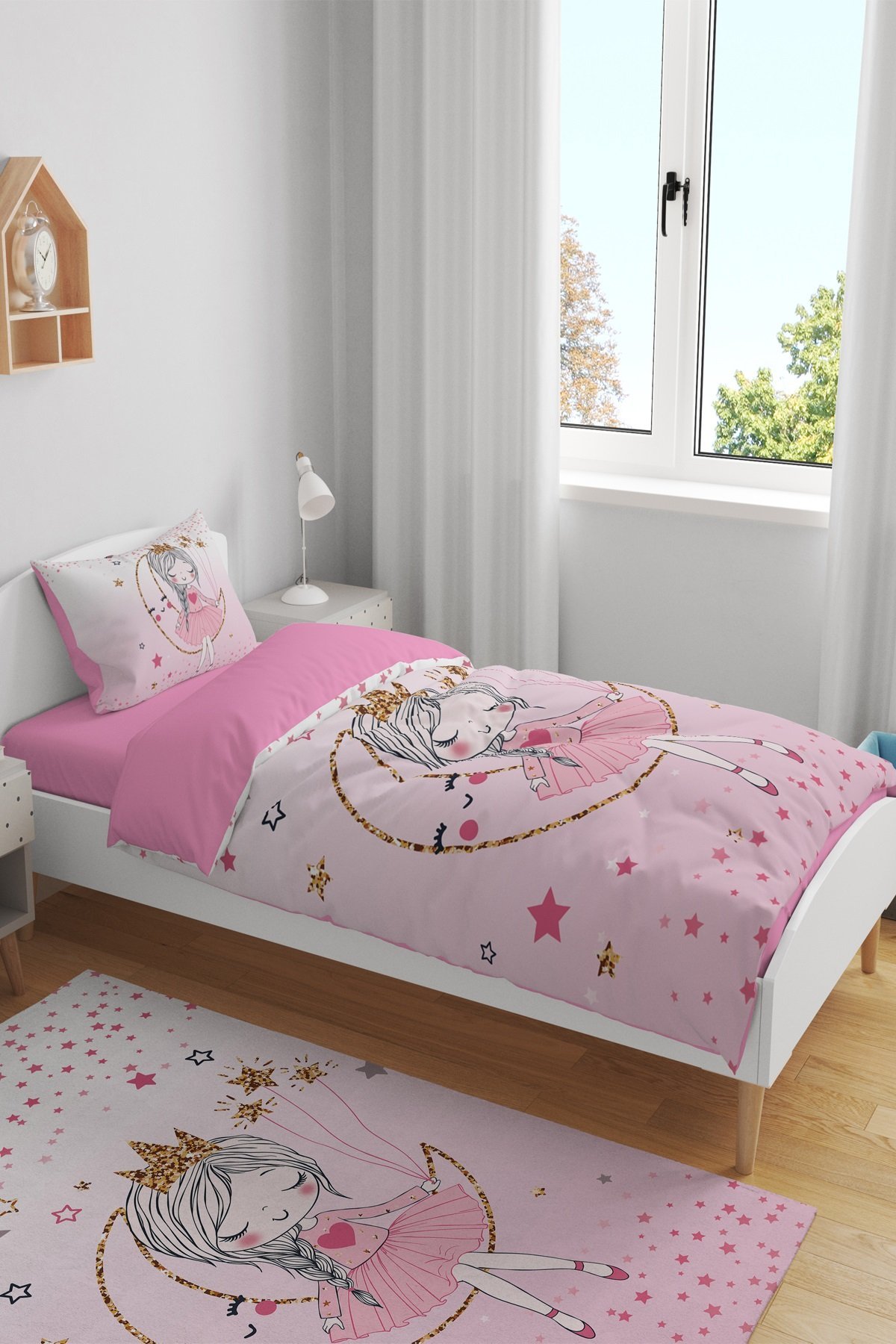 Pembe Yıldızlı Aydaki Prenses Desenli Tek Kişilik Bebek Çocuk Nevresim Takımı