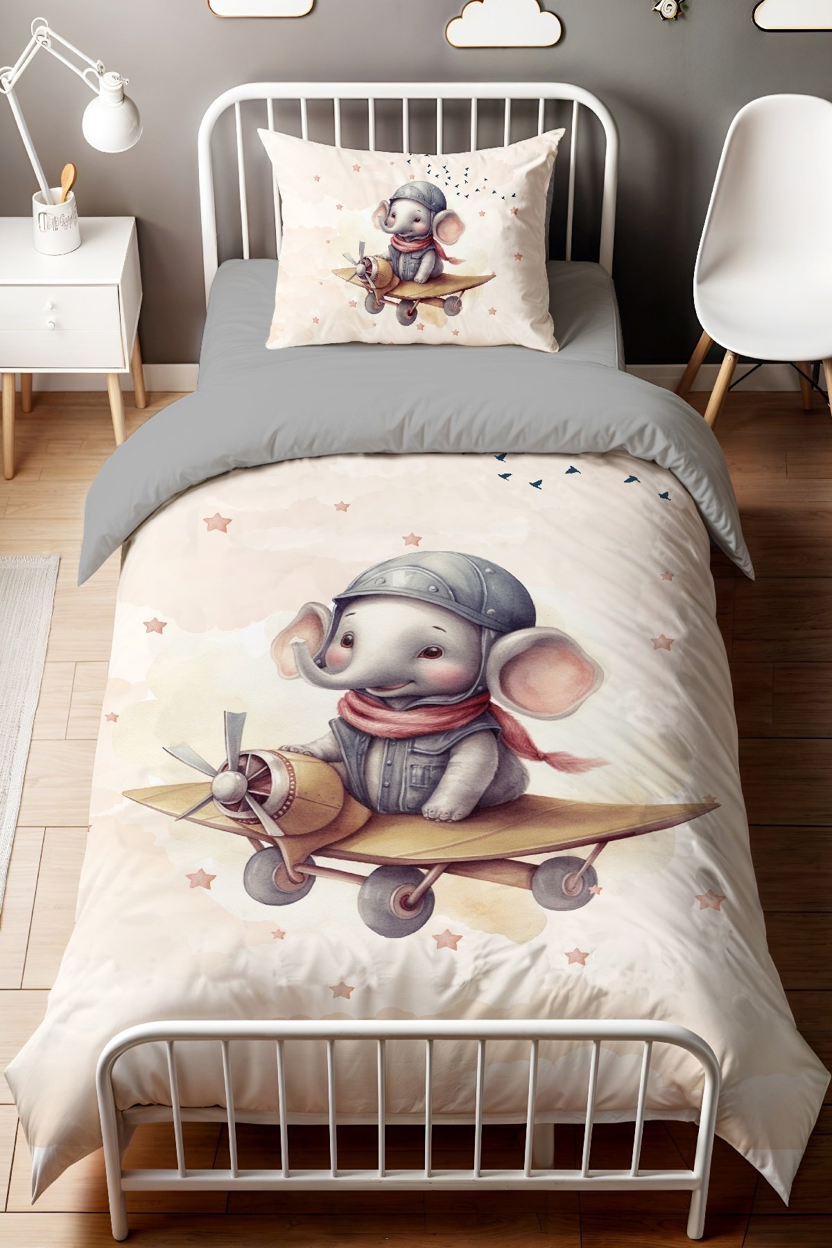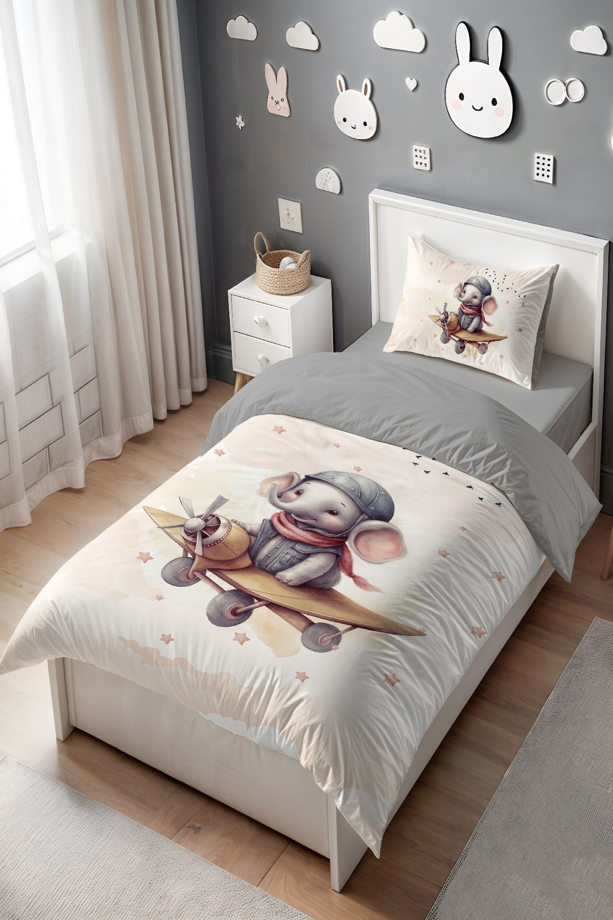 Pilot Fil Desenli Tek Kişilik Bebek Çocuk Nevresim Seti