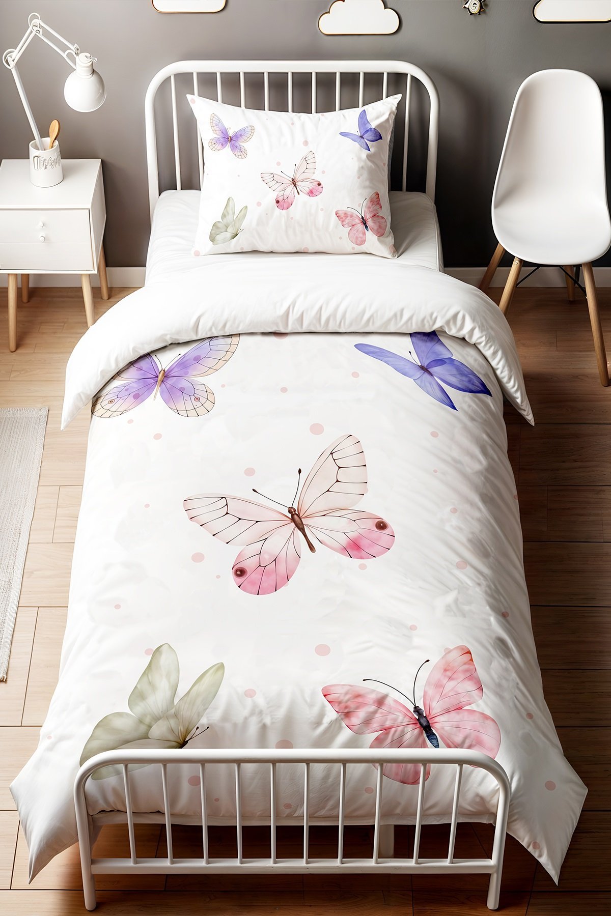 Puantiyeli Kelebek Rüyası Desenli Tek Kişilik Bebek Çocuk Nevresim Seti