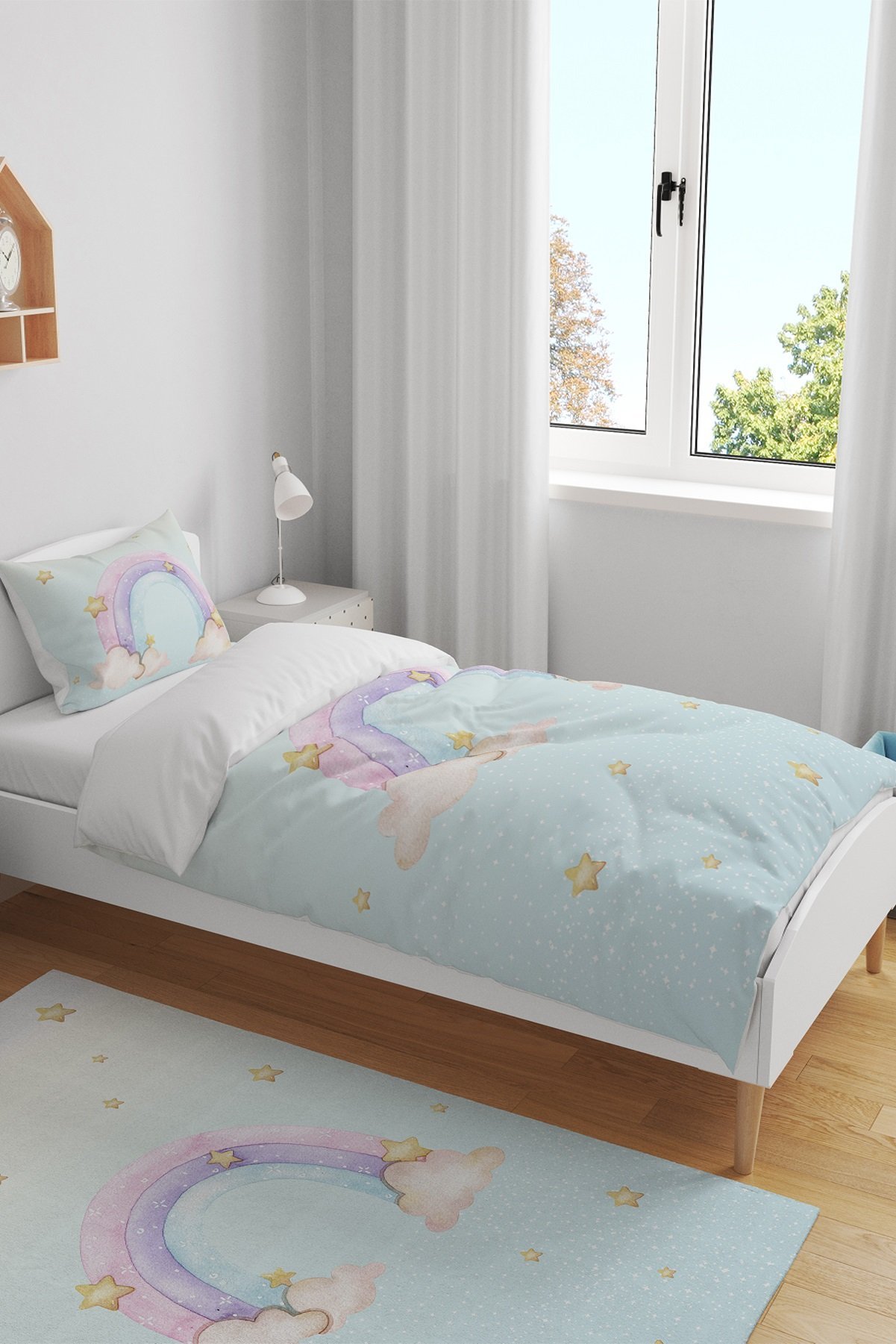 Pudra Mavi Gökkuşağı Desenli Tek Kişilik Bebek Çocuk Nevresim Takımı