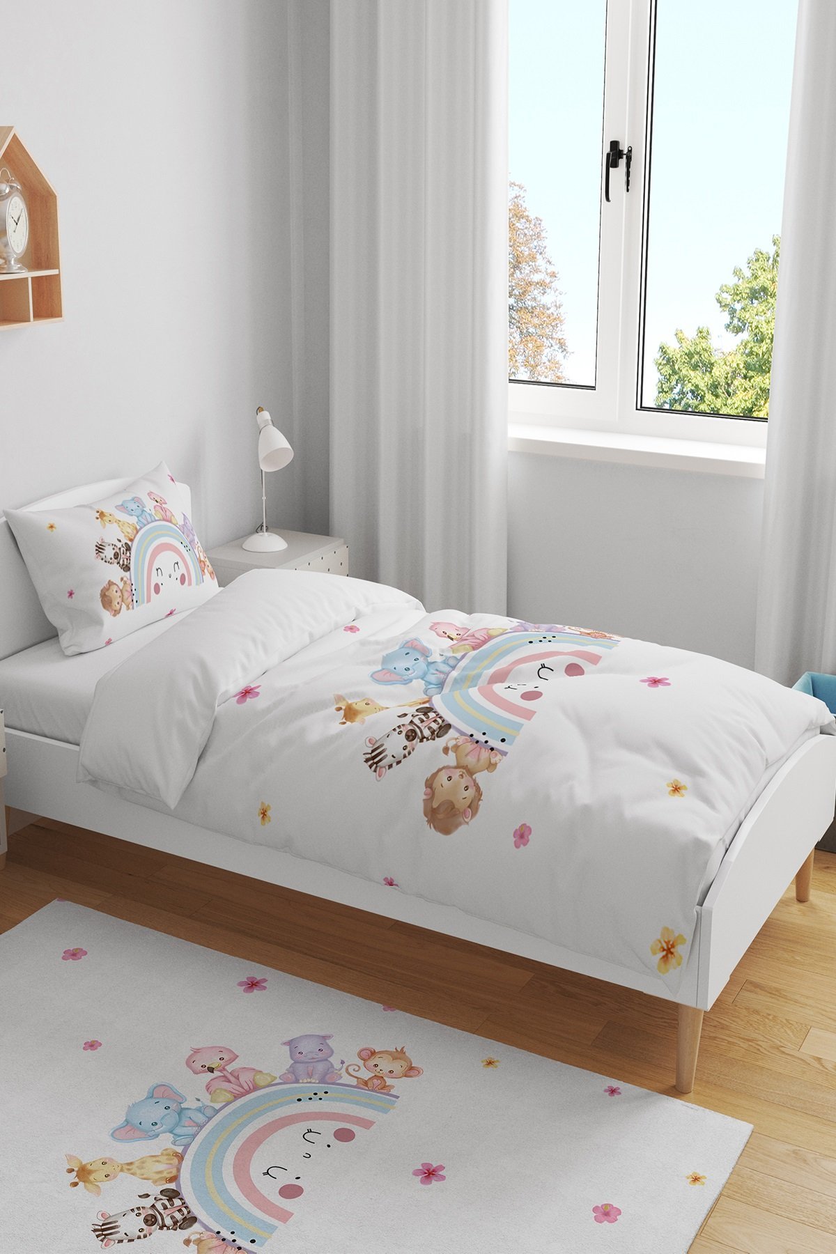 Rengarenk Gülen Gökkuşağı Hayvanları Desenli Tek Kişilik Bebek Çocuk Nevresim Seti