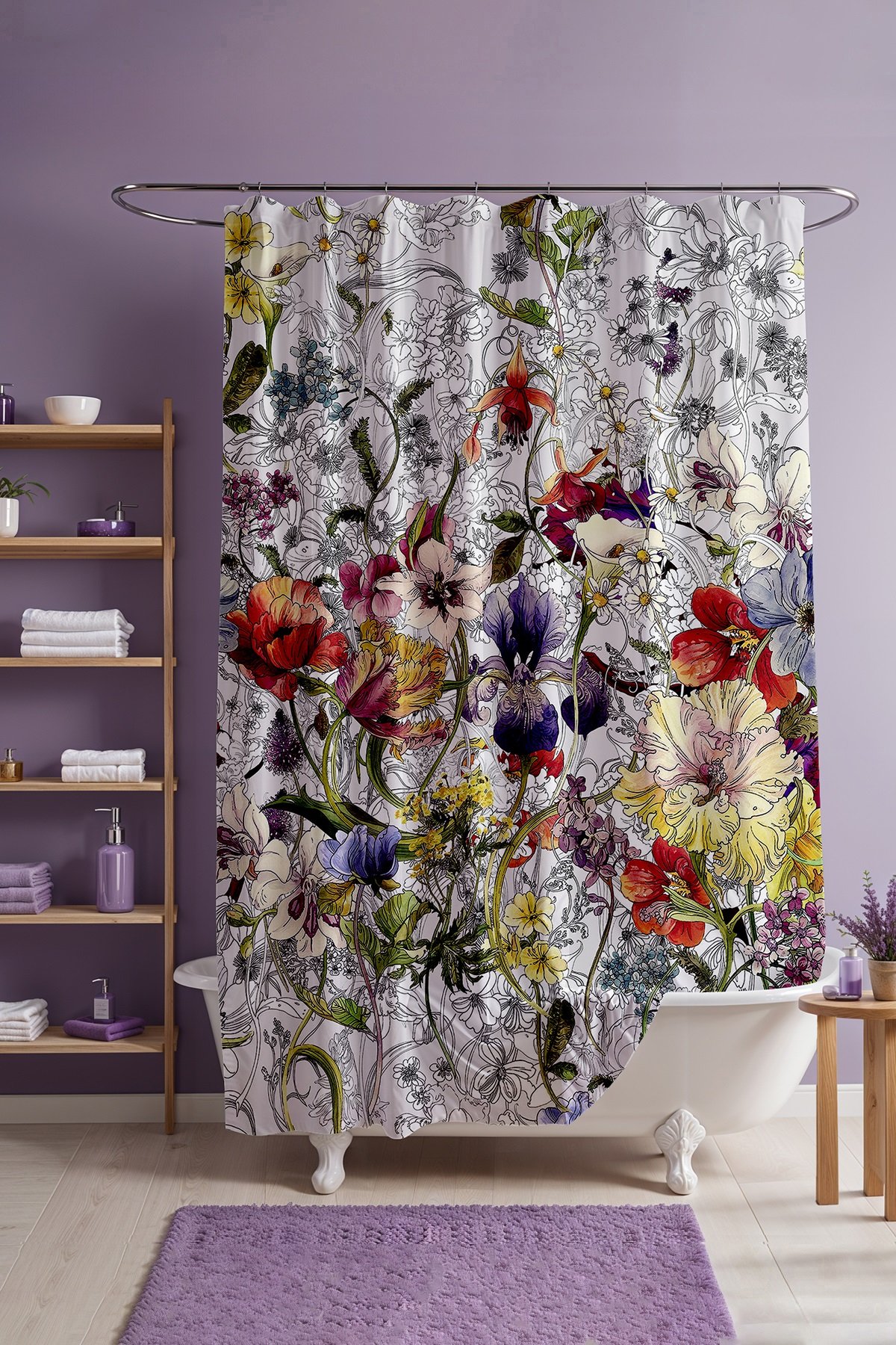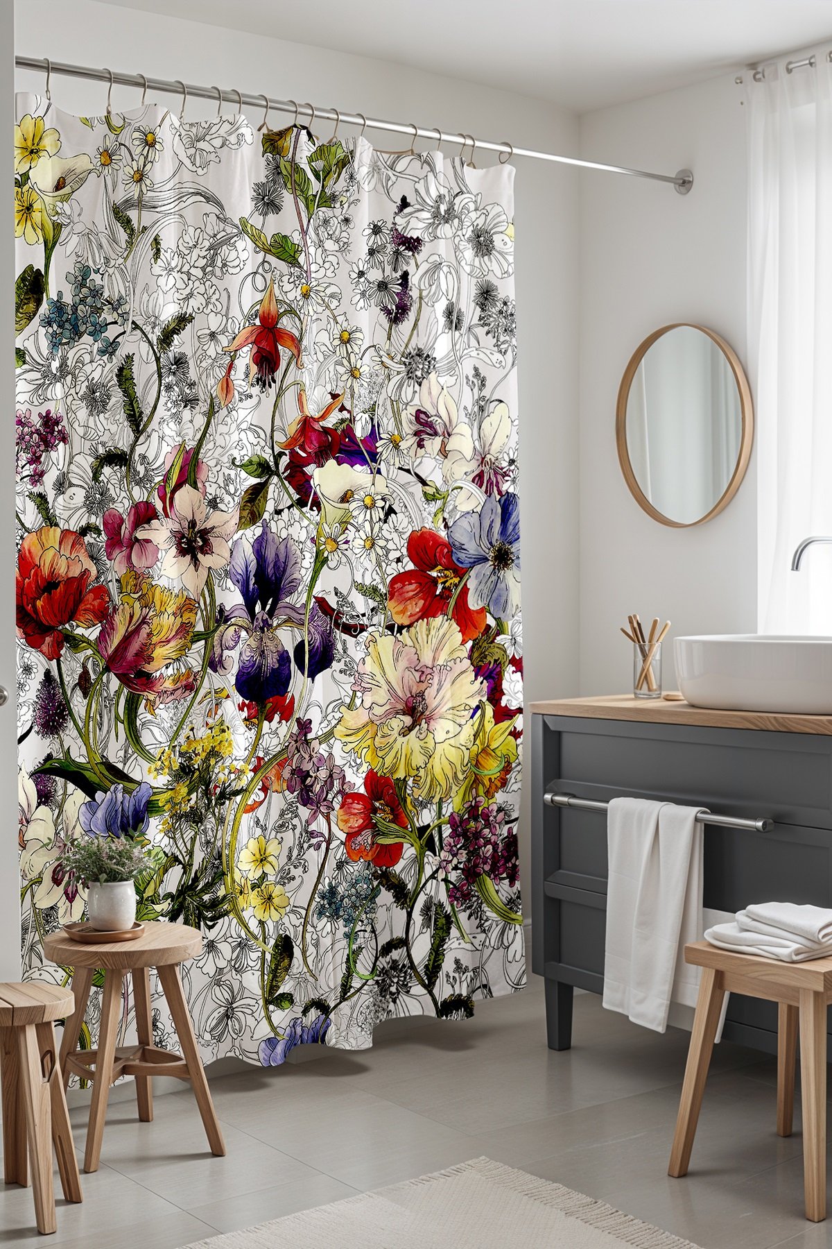 Renkli Çiçekli Boyama Motifi Desenli Duş Perdesi Küvet Perdesi 175x200cm