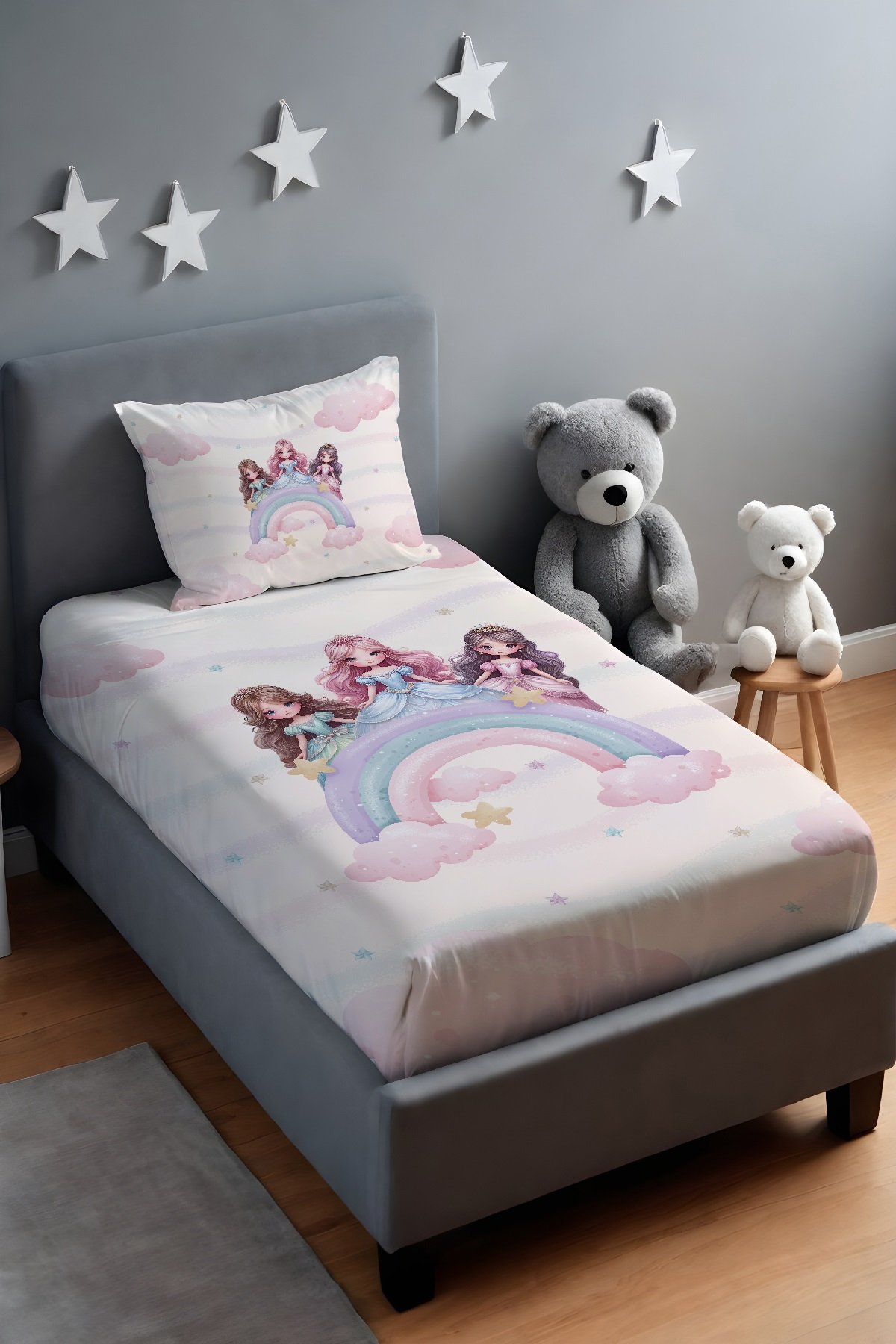Renkli Gökkuşağı Prensesler Desenli Yatak Örtüsü ve Yastık Kılıfı