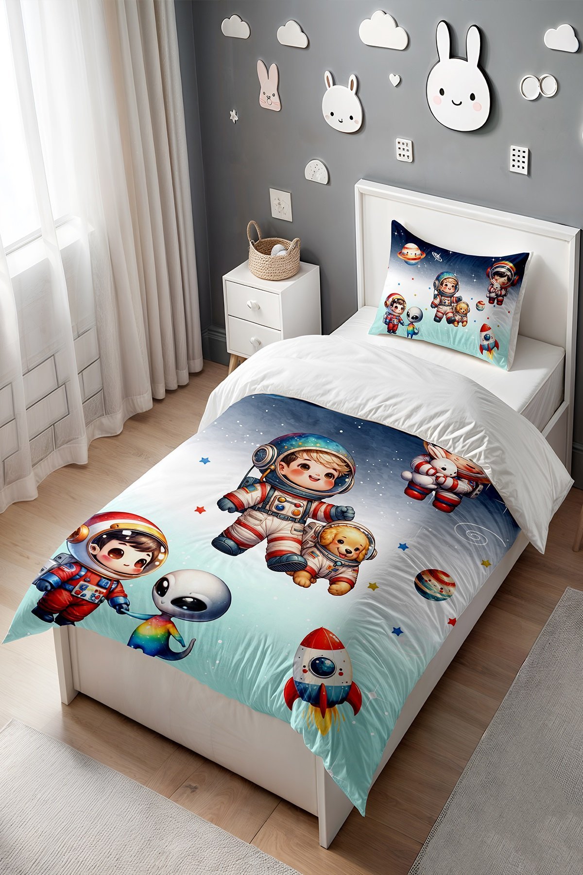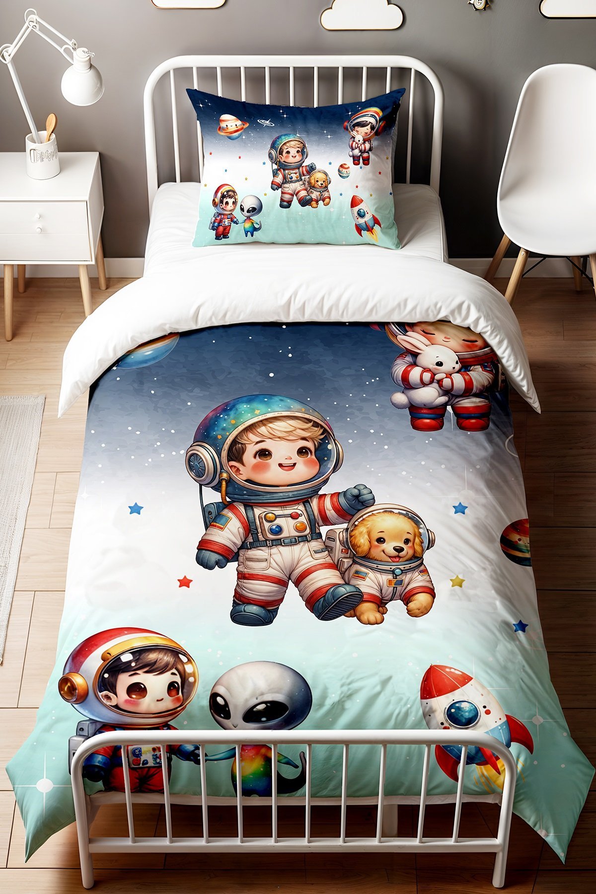 Renkli Minik Astronotlar Desenli Tek Kişilik Bebek Çocuk Nevresim Seti