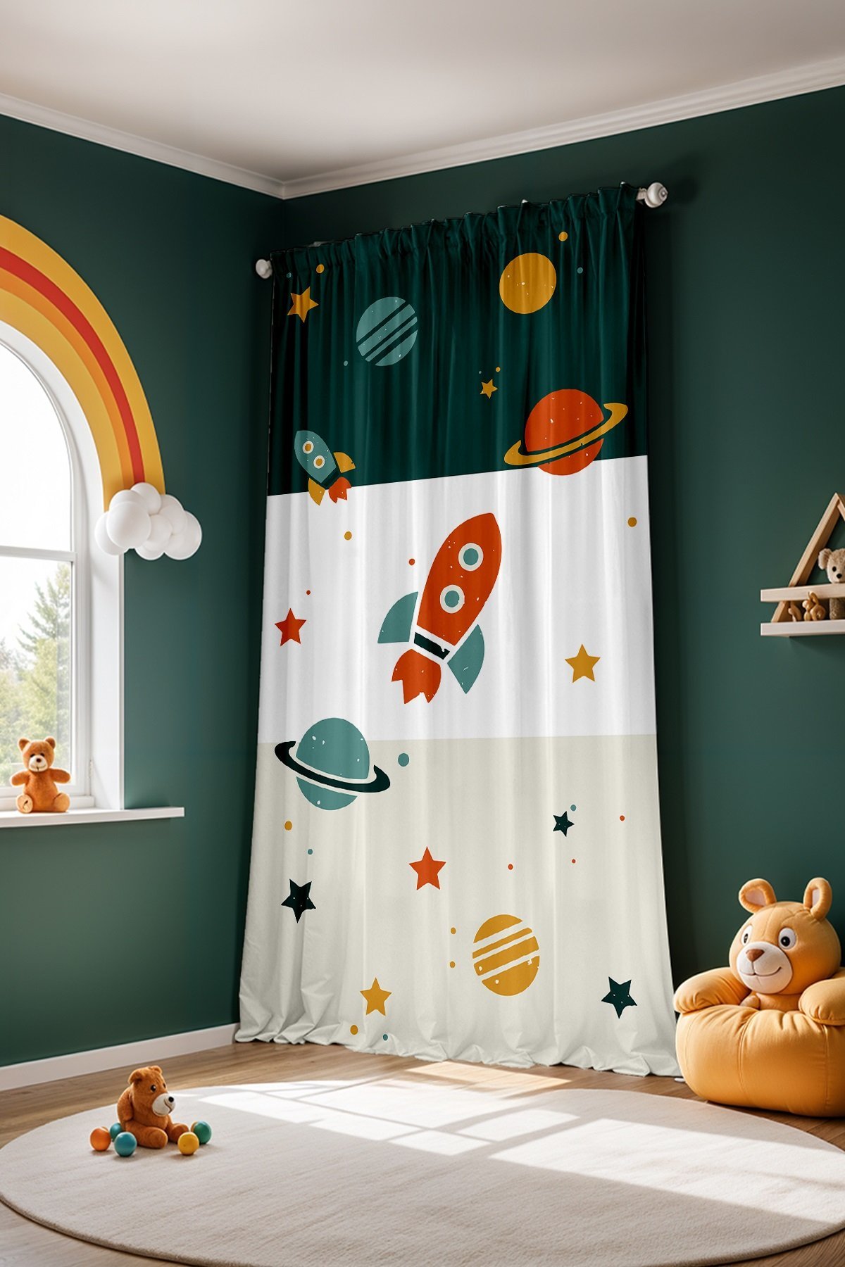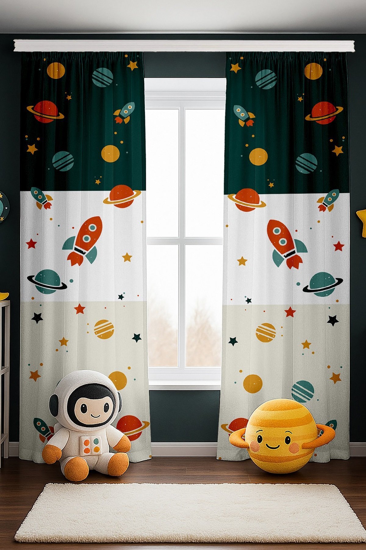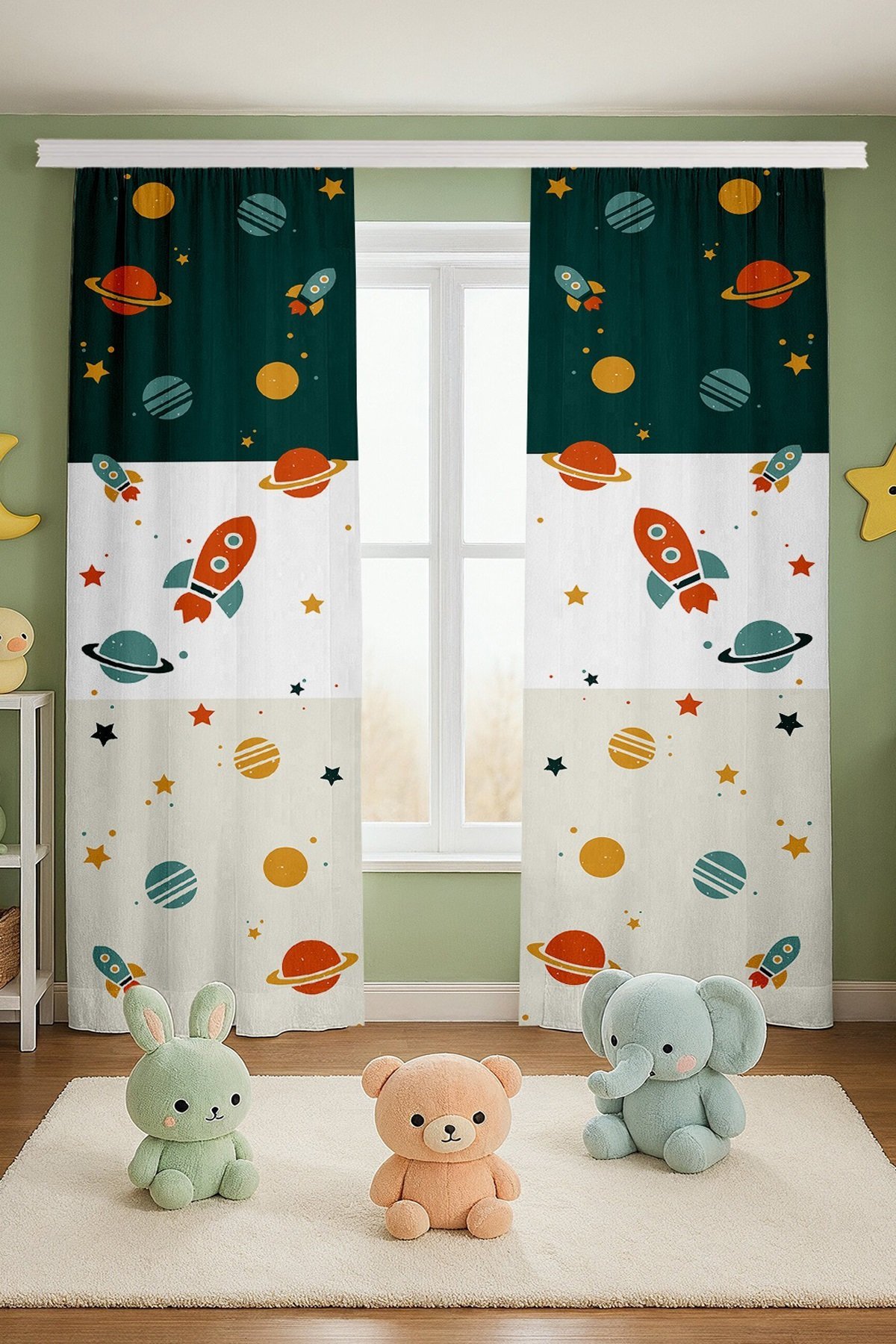 Retro Yeşil Krem Uzay Araçları Desenli Çocuk Bebek Odası Fon Perde (Tek Kanat Fiyatlandırma)