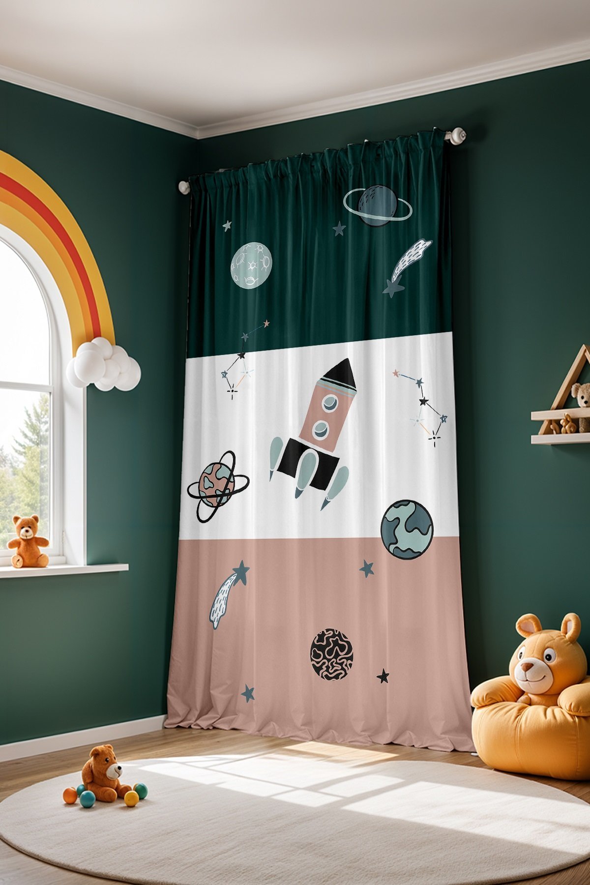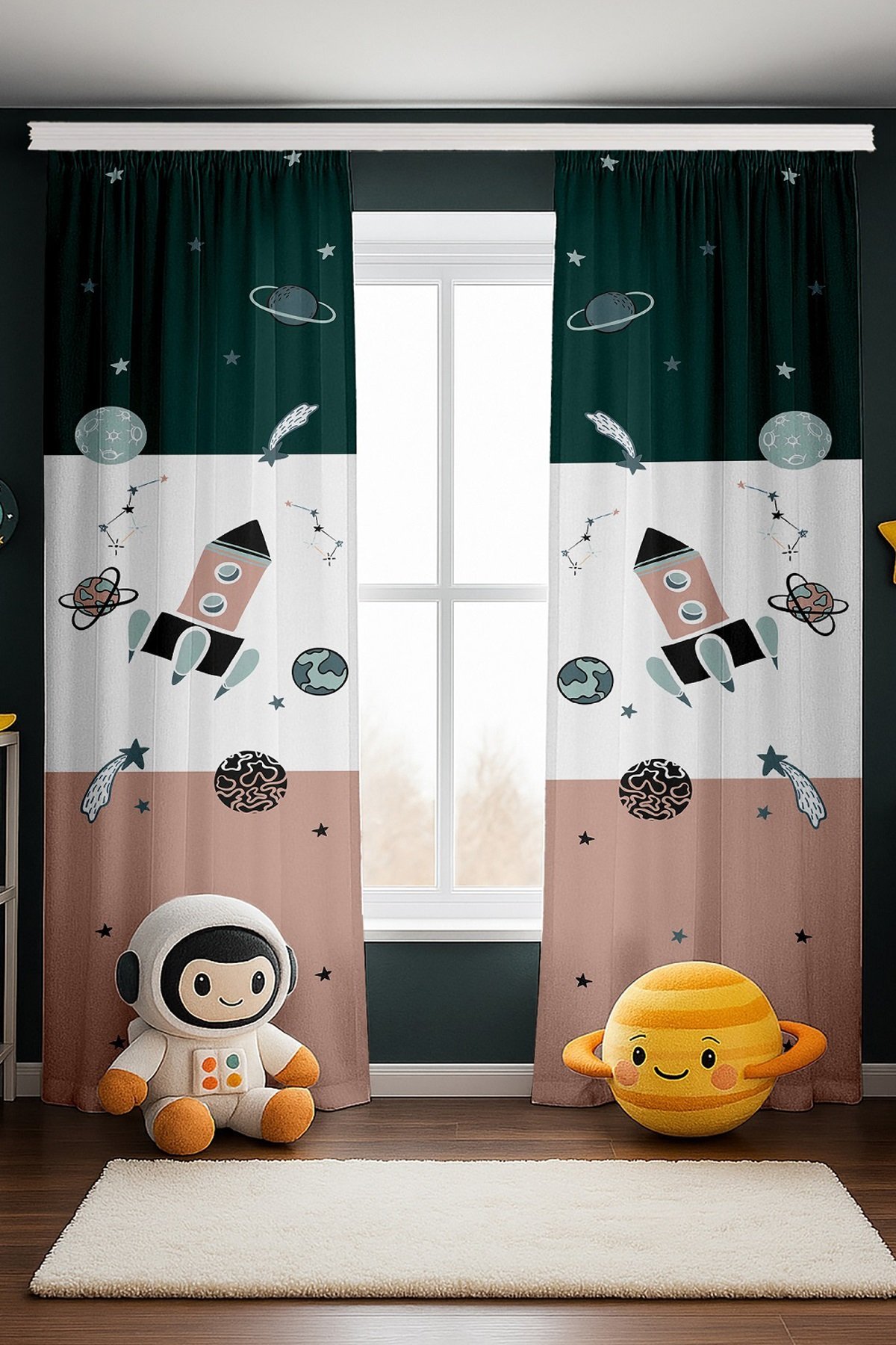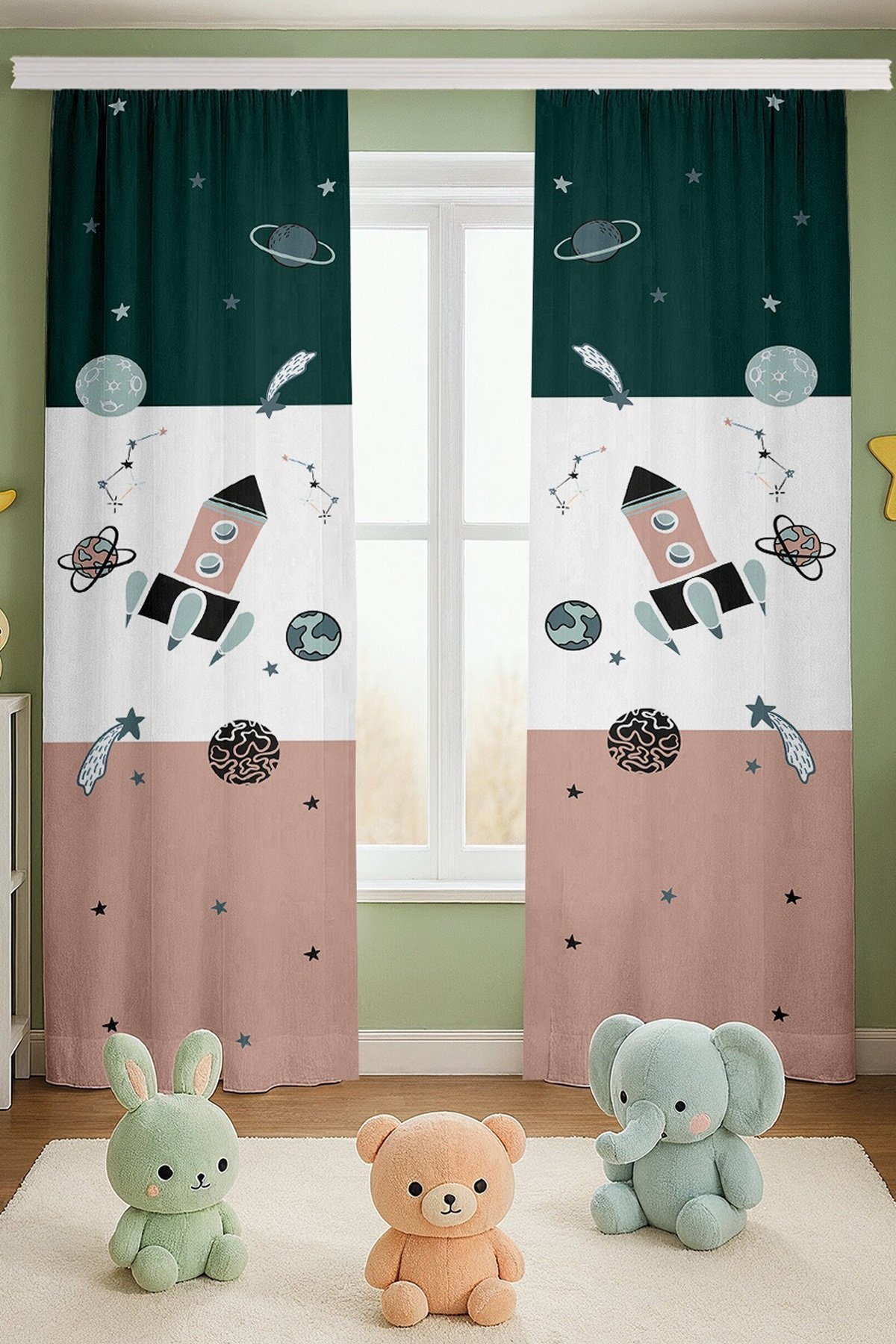 Retro Yeşil Pembe Uzay Araçları Desenli Çocuk Bebek Odası Fon Perde (Tek Kanat Fiyatlandırma)