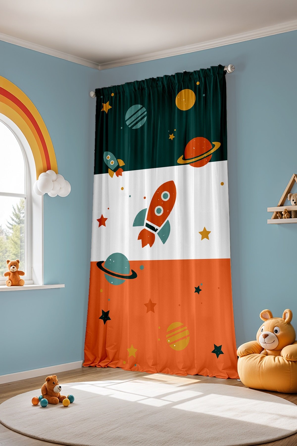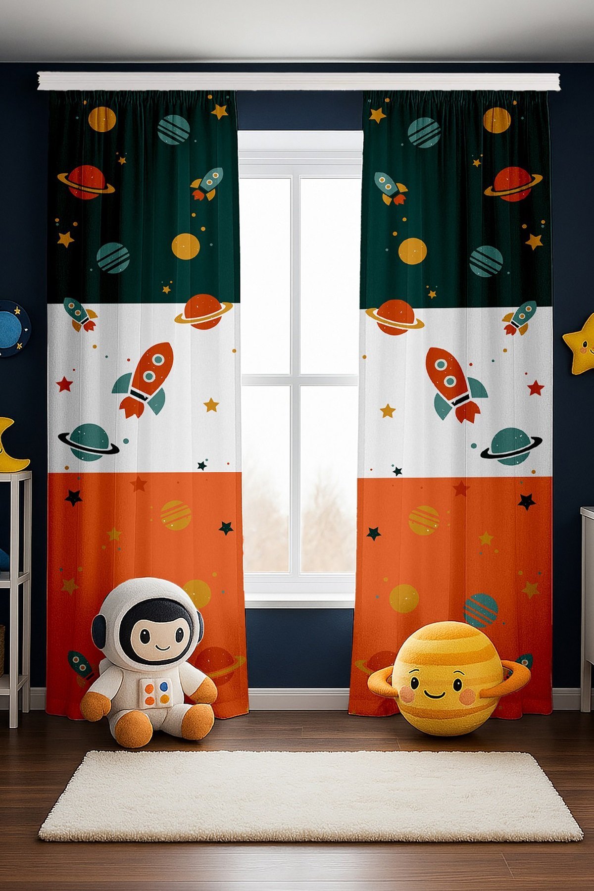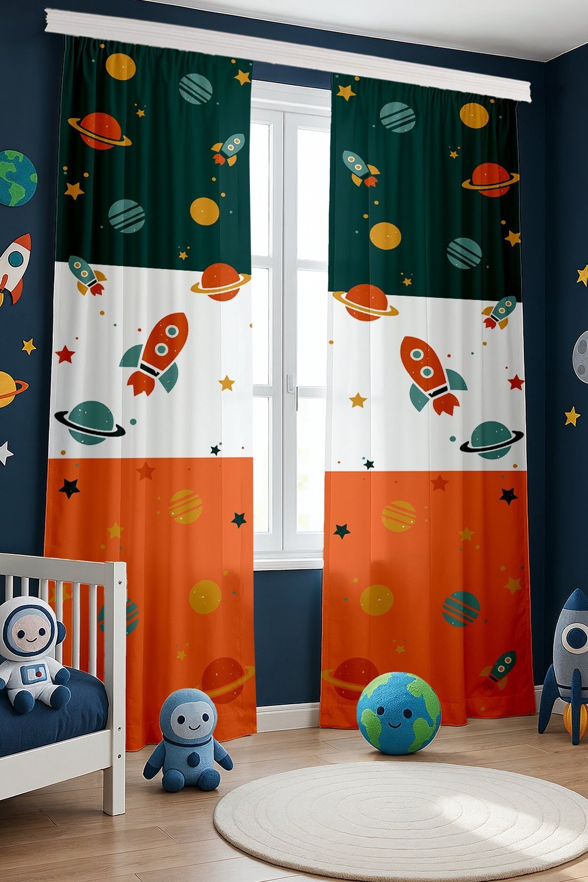 Retro Yeşil Turuncu Uzay Araçları Desenli Çocuk Bebek Odası Fon Perde (Tek Kanat Fiyatlandırma)