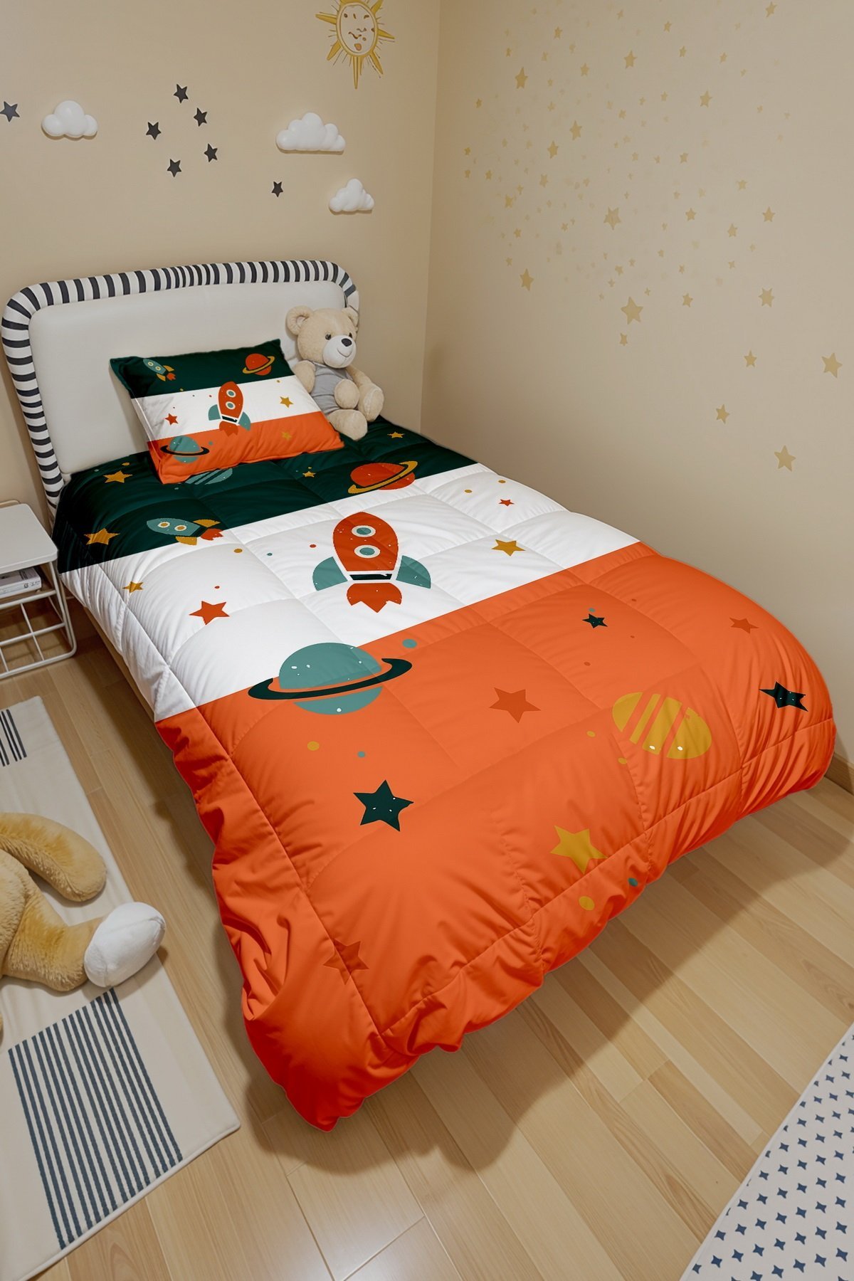 Retro Yeşil Turuncu Uzay Araçları Desenli Tek Kişilik Yorgan ve Yastık Kılıfı