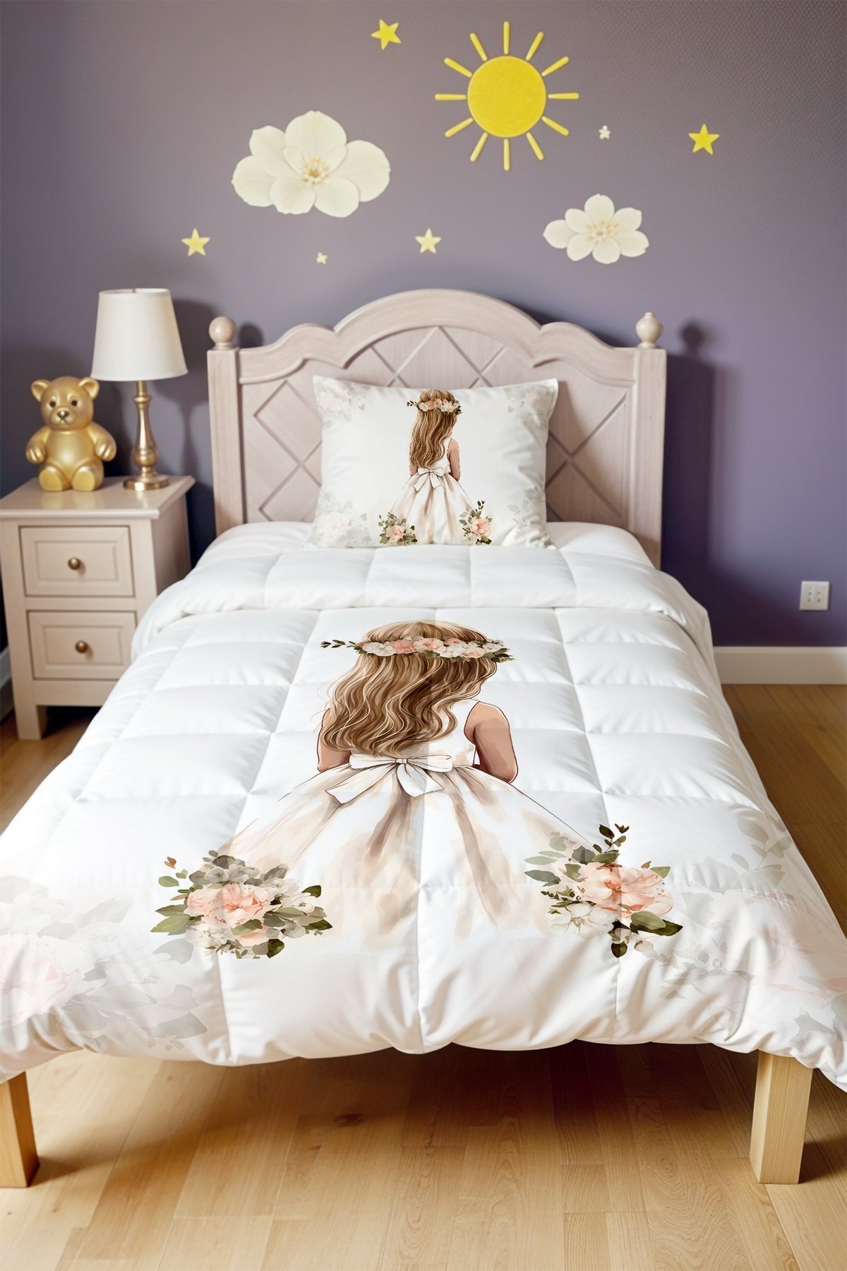 Sade Sarı Saçlı Prenses Desenli Tek Kişilik Yorgan ve Yastık Kılıfı