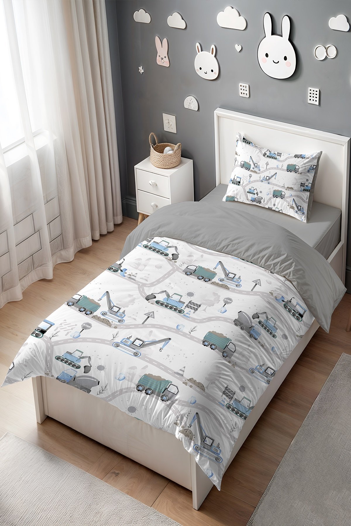 Şantiye Araçları Desenli Tek Kişilik Bebek Çocuk Nevresim Seti