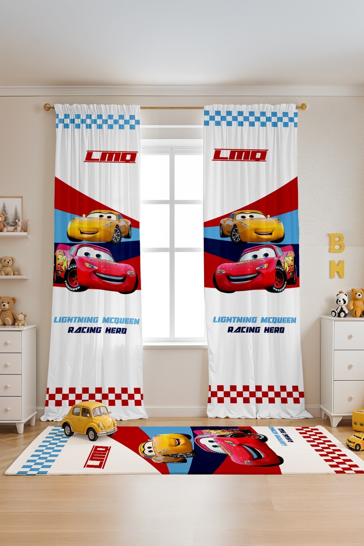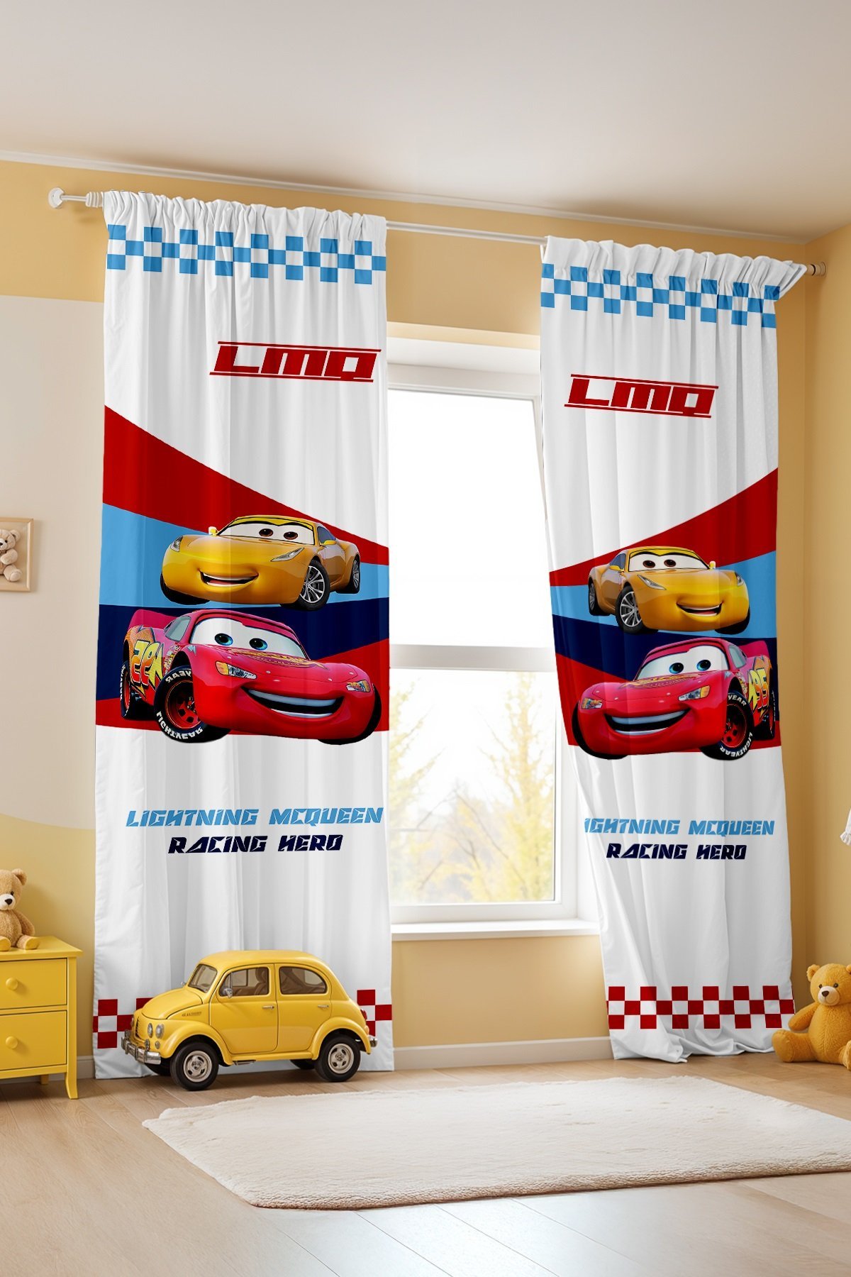Şeritli Mcquen Desenli Çocuk Bebek Odası Fon Perde (Tek Kanat Fiyatlandırma)