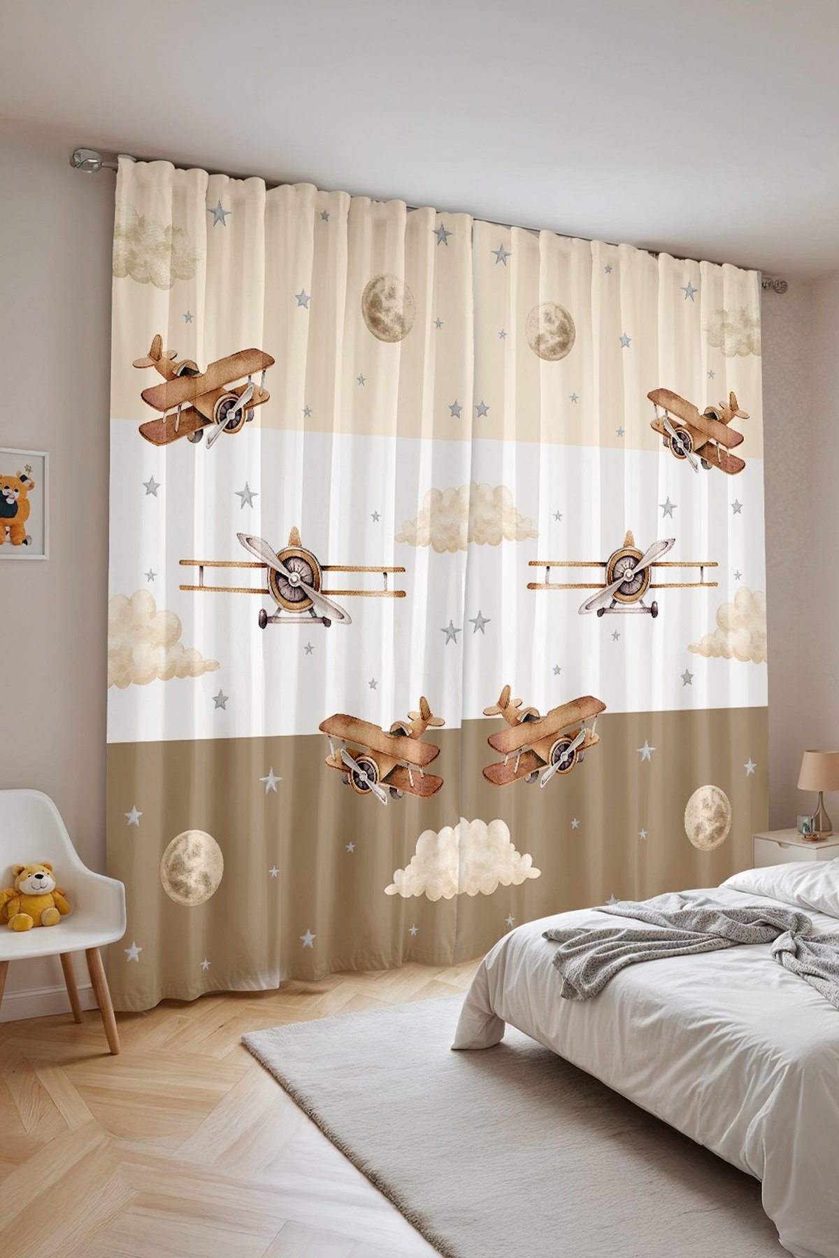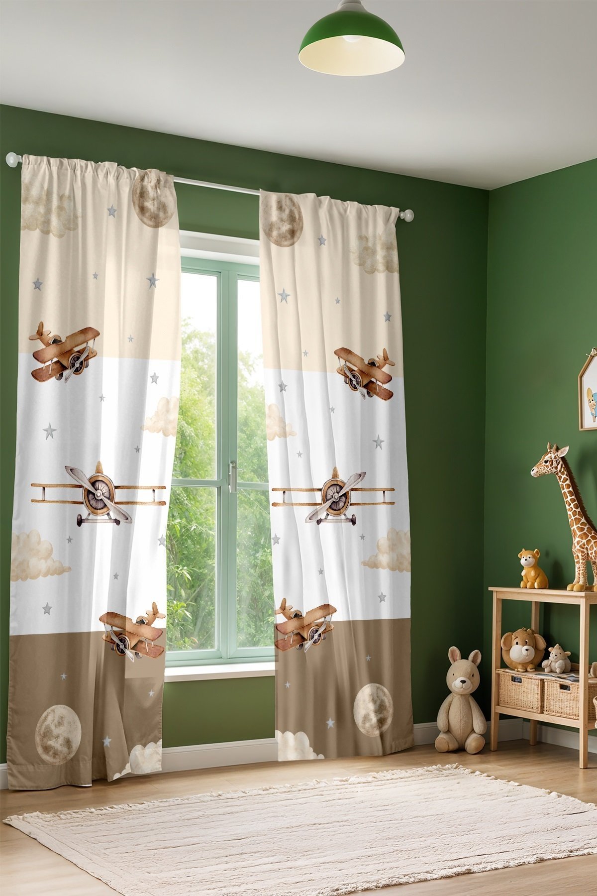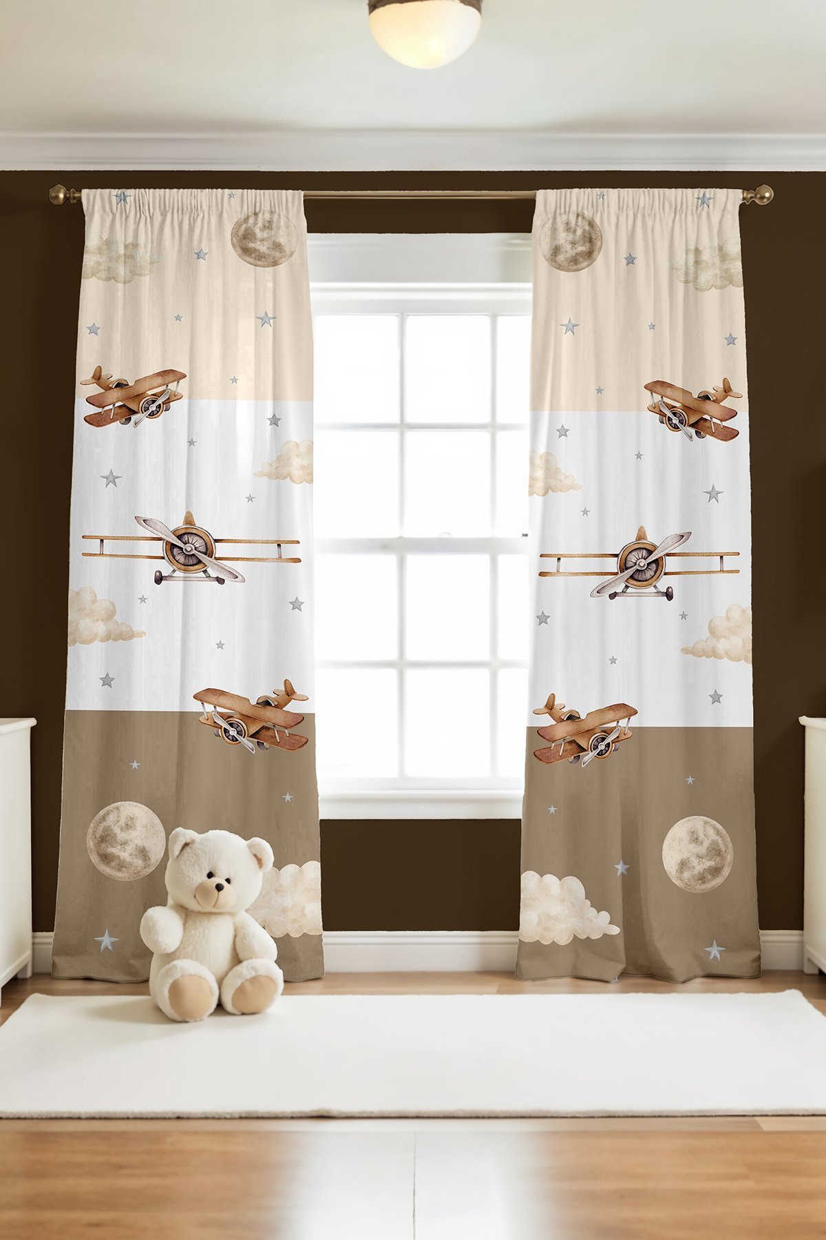 Şeritli Uçaklar Desenli Çocuk Bebek Odası Fon Perde (Tek Kanat Fiyatlandırma)