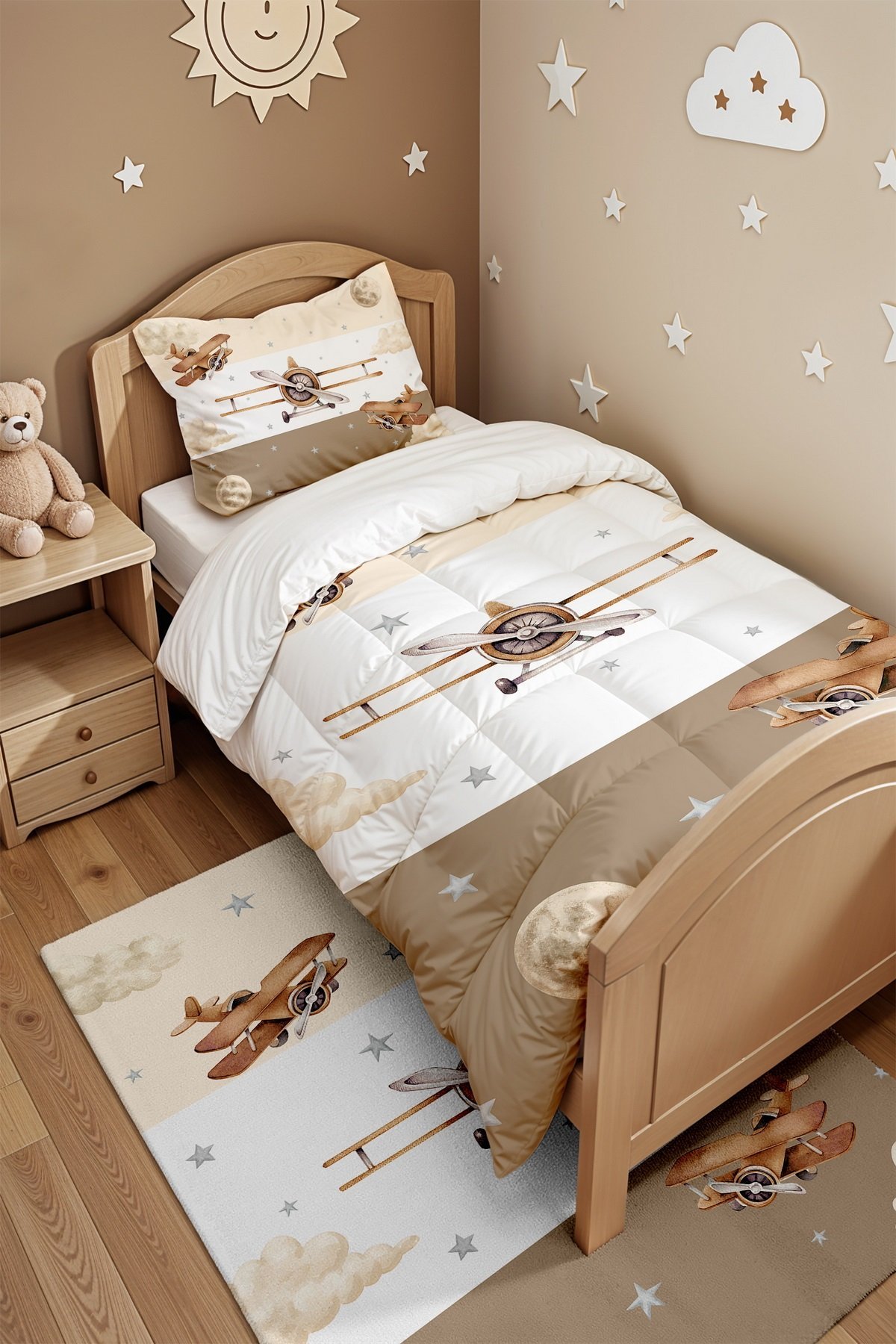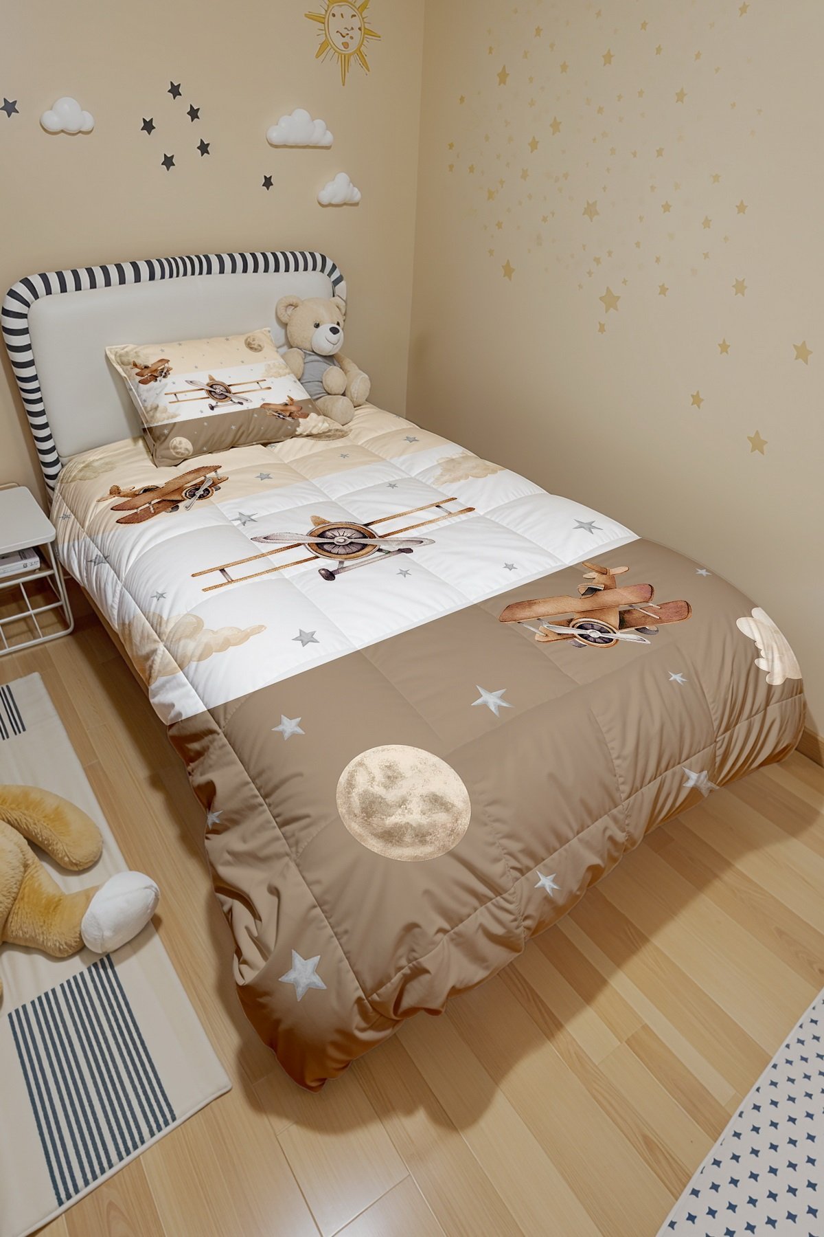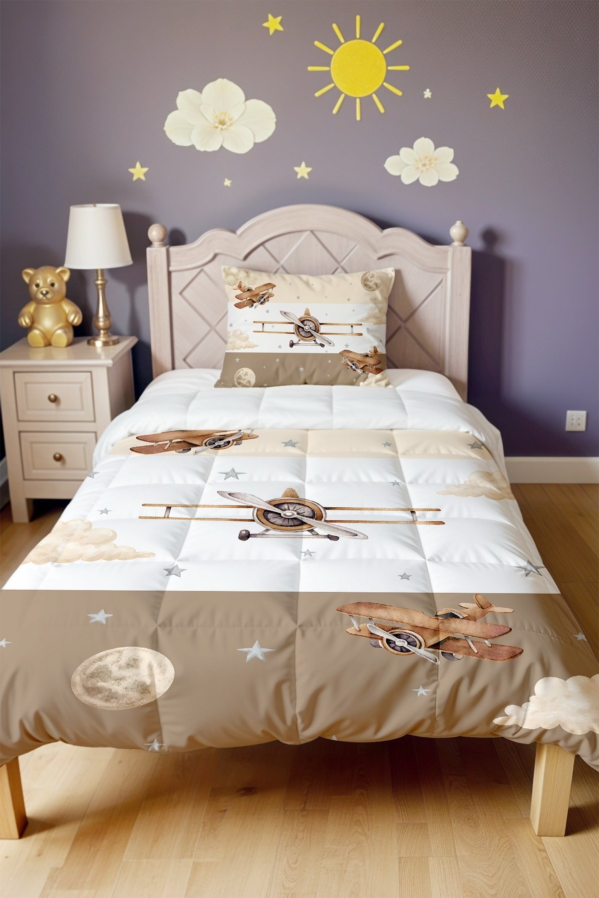 Şeritli Uçaklar Desenli Tek Kişilik Yorgan ve Yastık Kılıfı