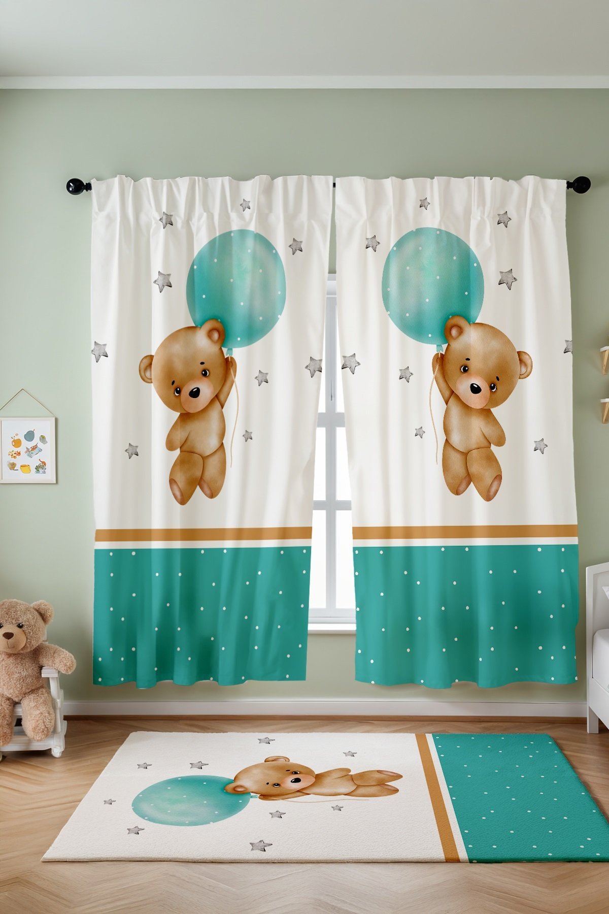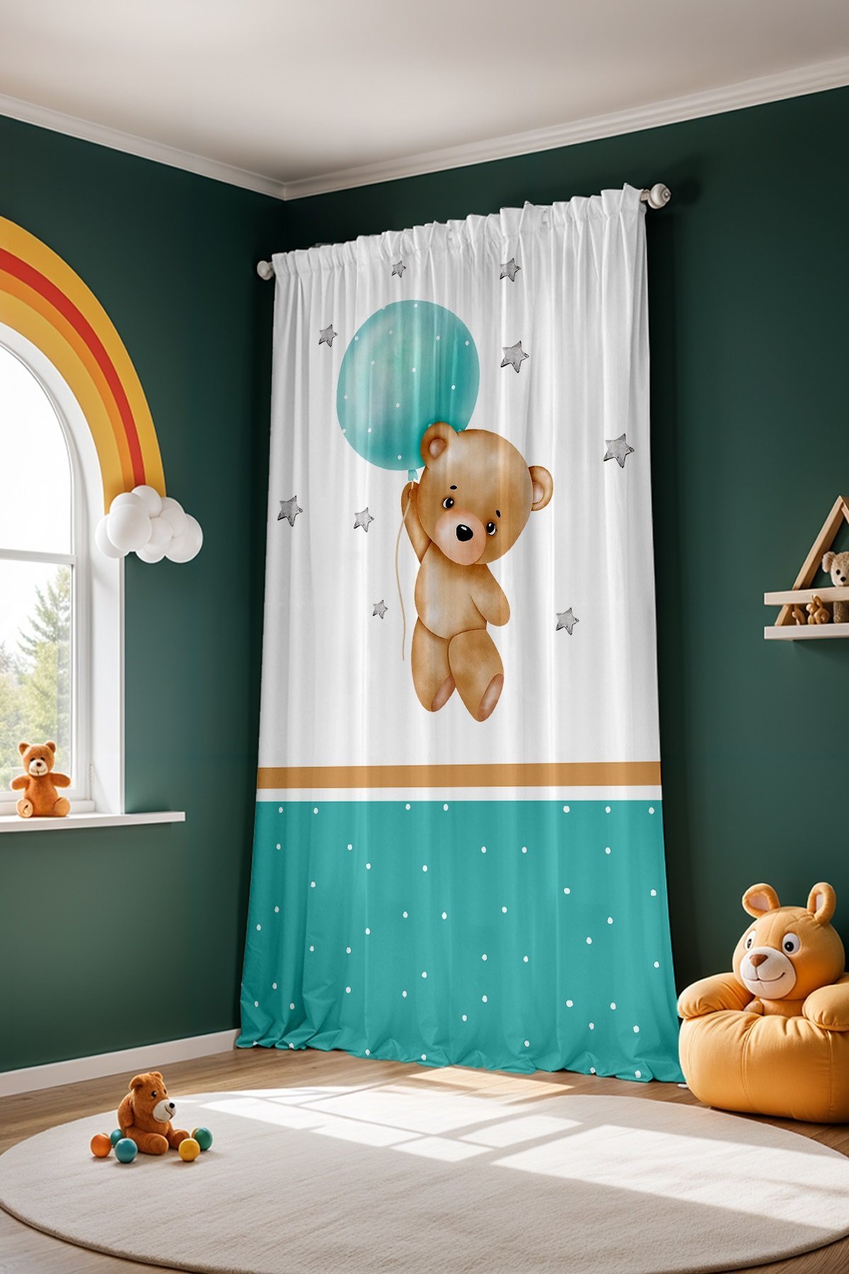 Şeritli Uçan Ayıcık Desenli Çocuk Bebek Odası Fon Perde (Tek Kanat Fiyatlandırma)