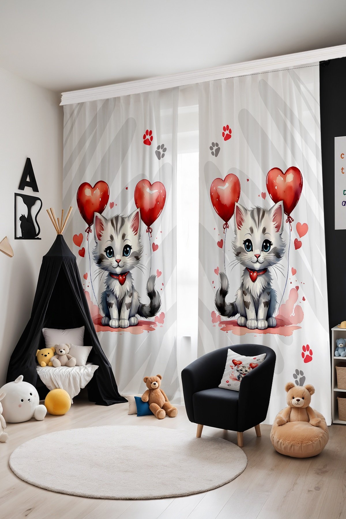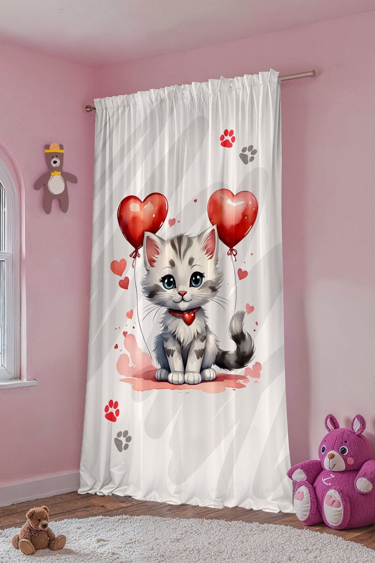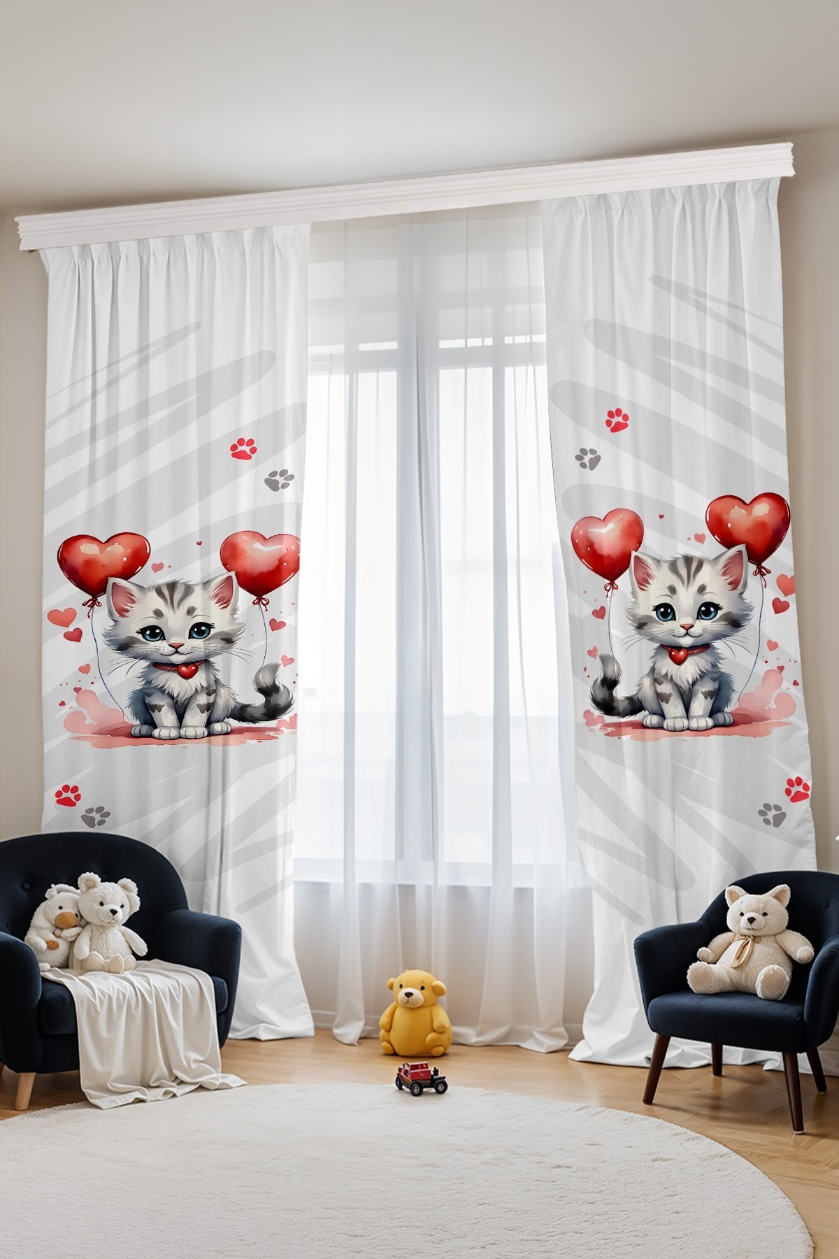 Sevimli Kedi Desenli Çocuk Bebek Odası Fon Perde (Tek Kanat Fiyatlandırma)