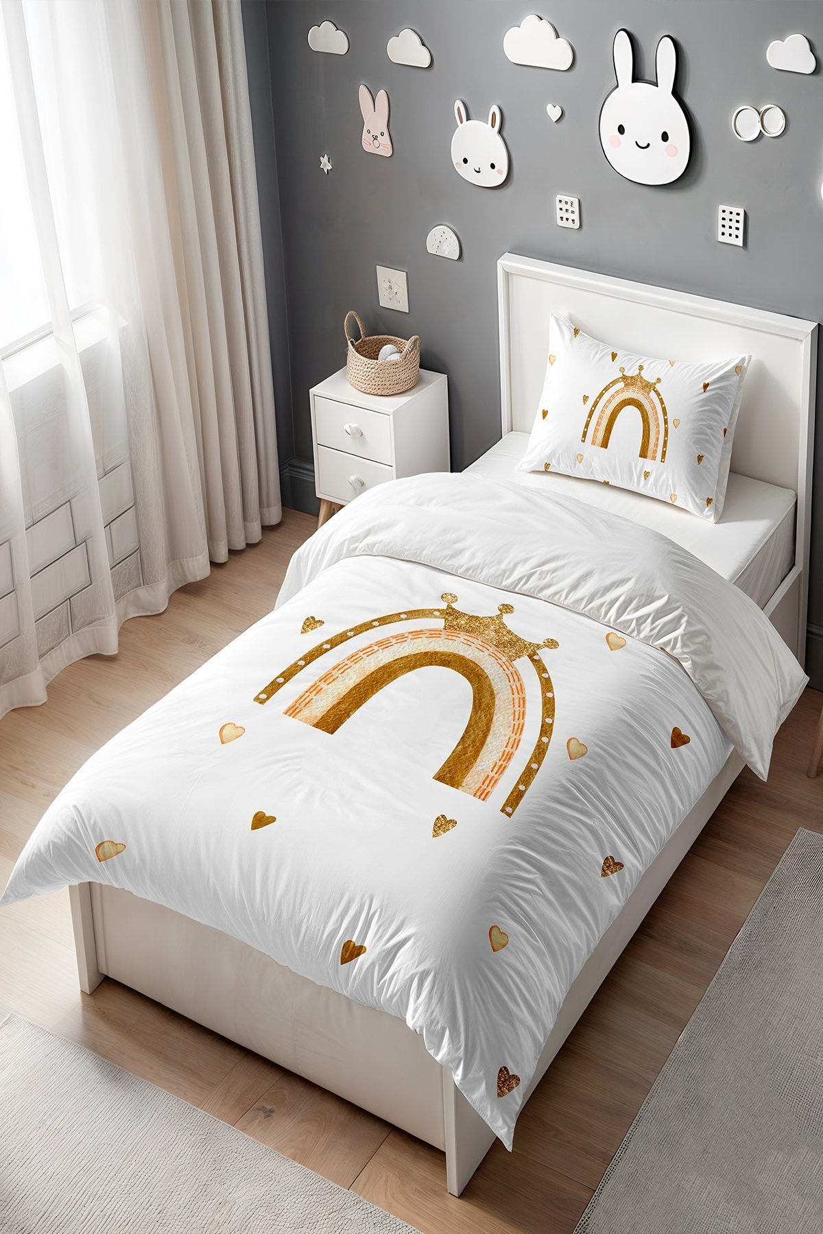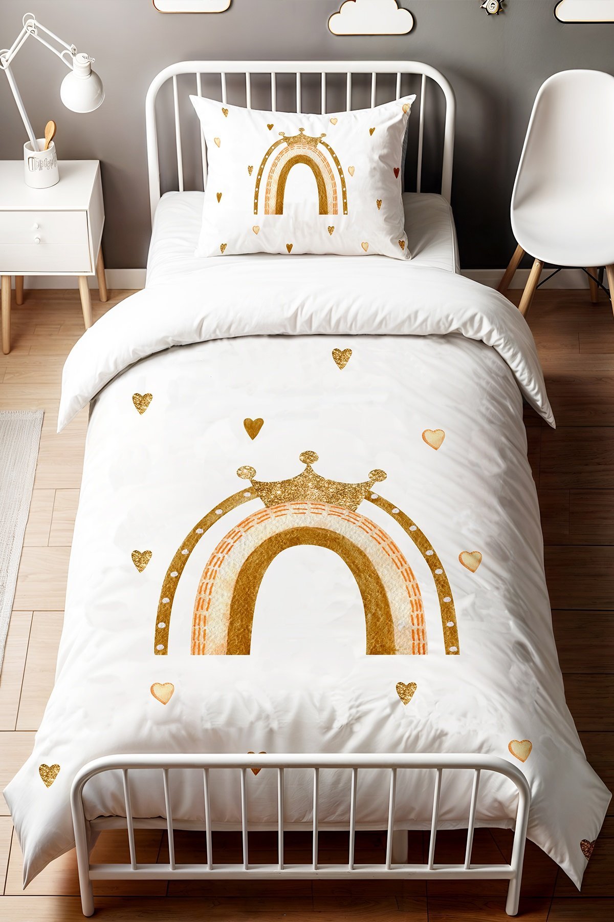 Simli Taçlı Gökkuşağı Desenli Tek Kişilik Bebek Çocuk Nevresim Seti