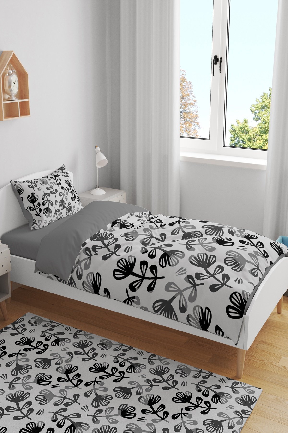Siyah Beyaz Çiçekler Desenli Tek Kişilik Bebek Çocuk Nevresim Takımı