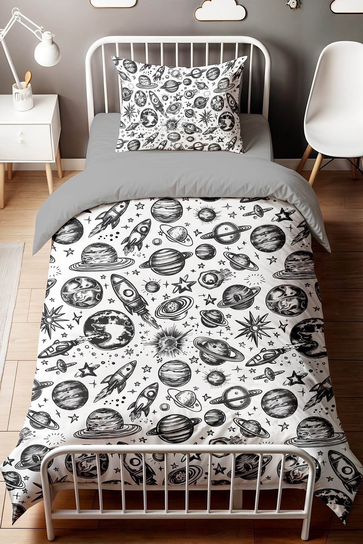 Siyah Beyaz Küçük Galaksi Desenli Tek Kişilik Bebek Çocuk Nevresim Seti