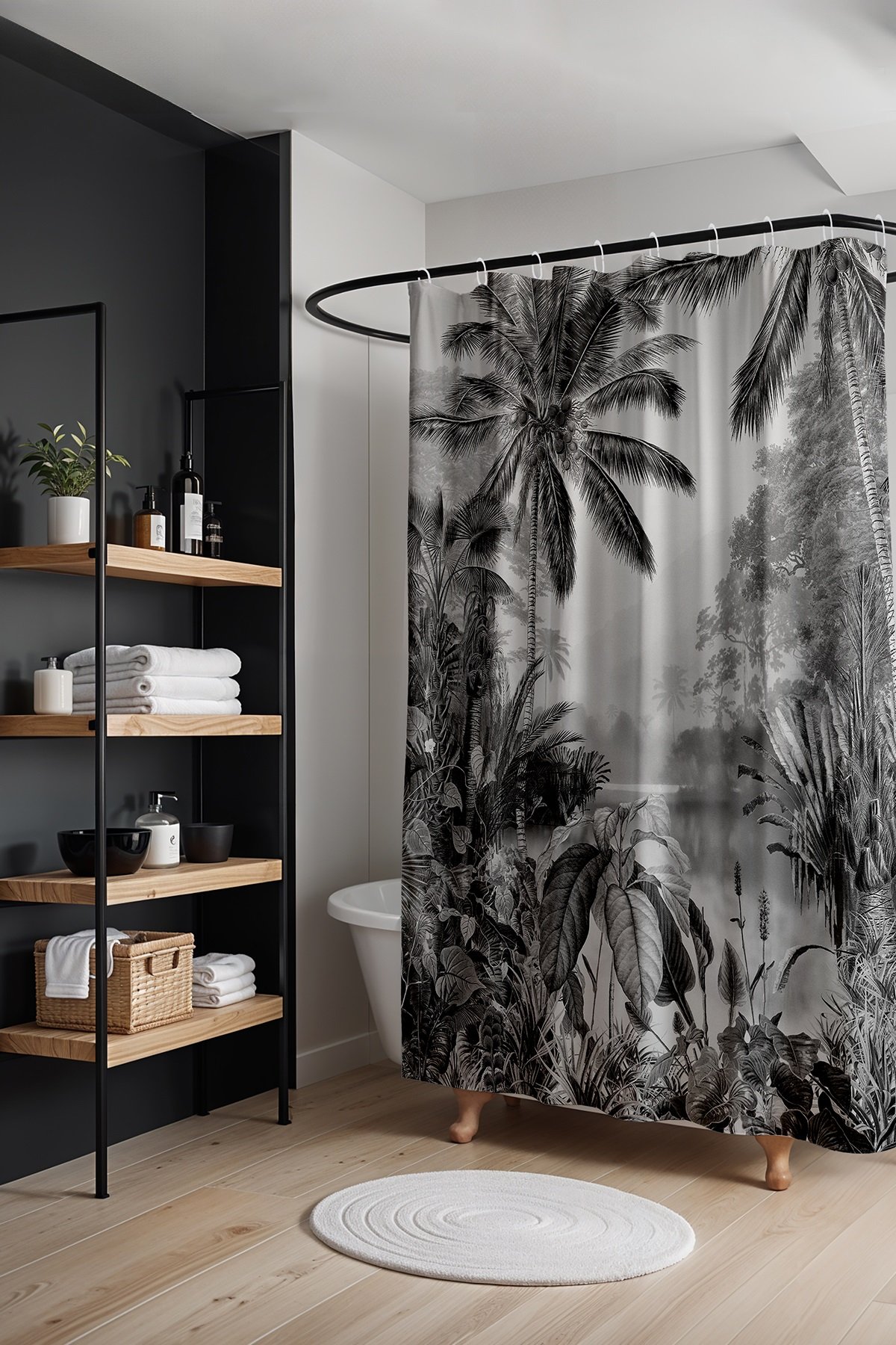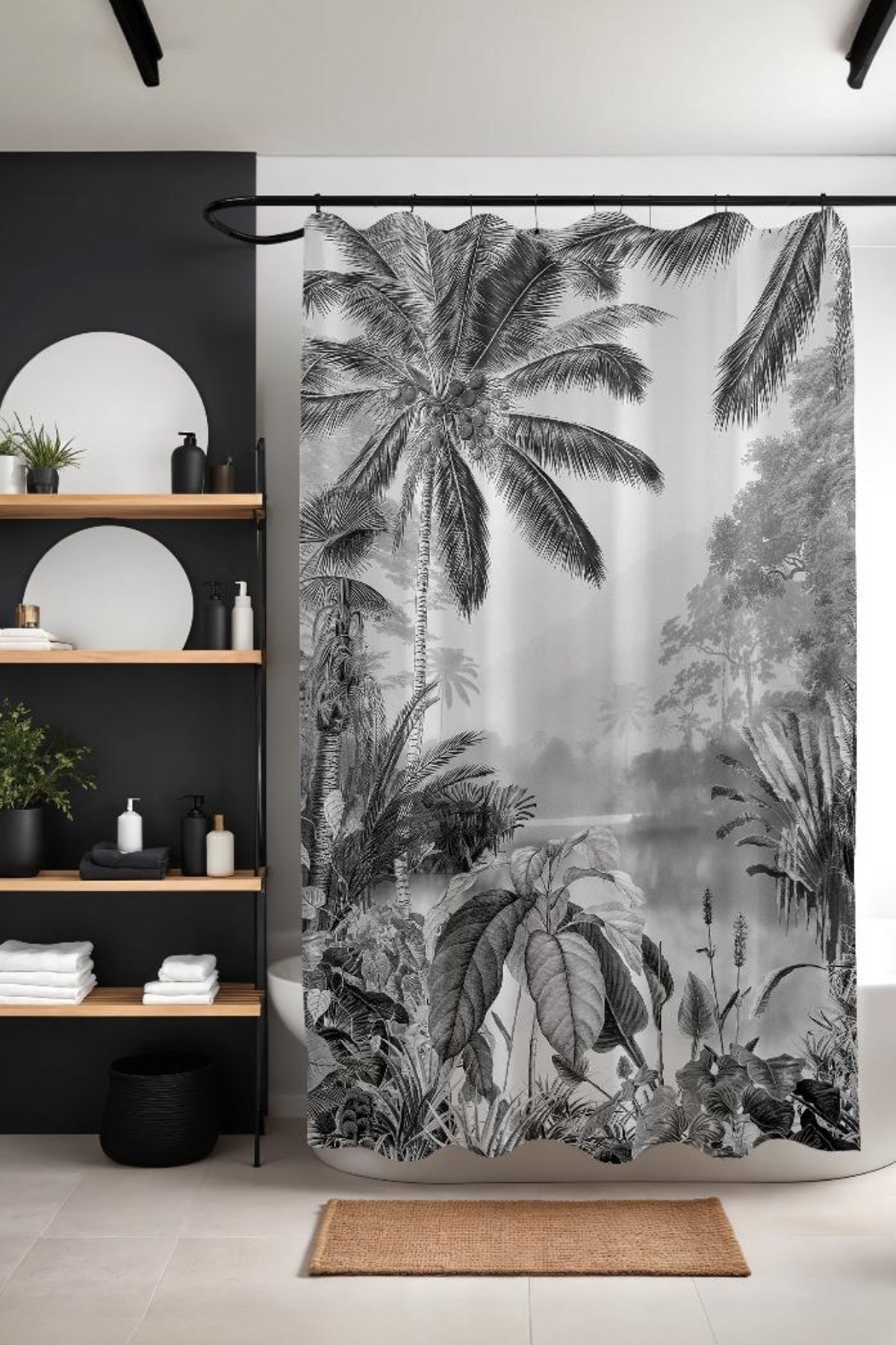 Siyah Palmiyeli Orman Desenli Duş Perdesi Küvet Perdesi 175x200cm