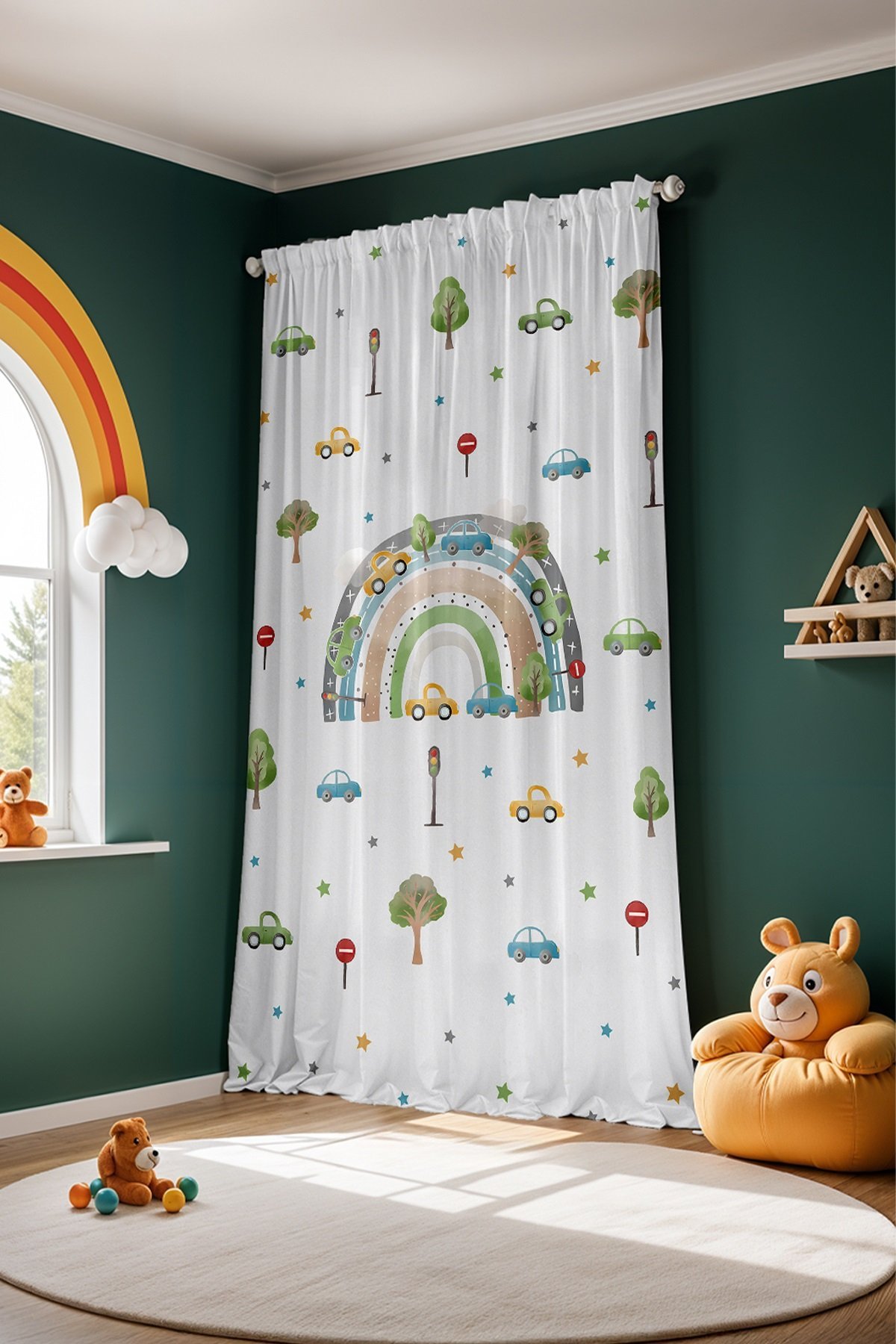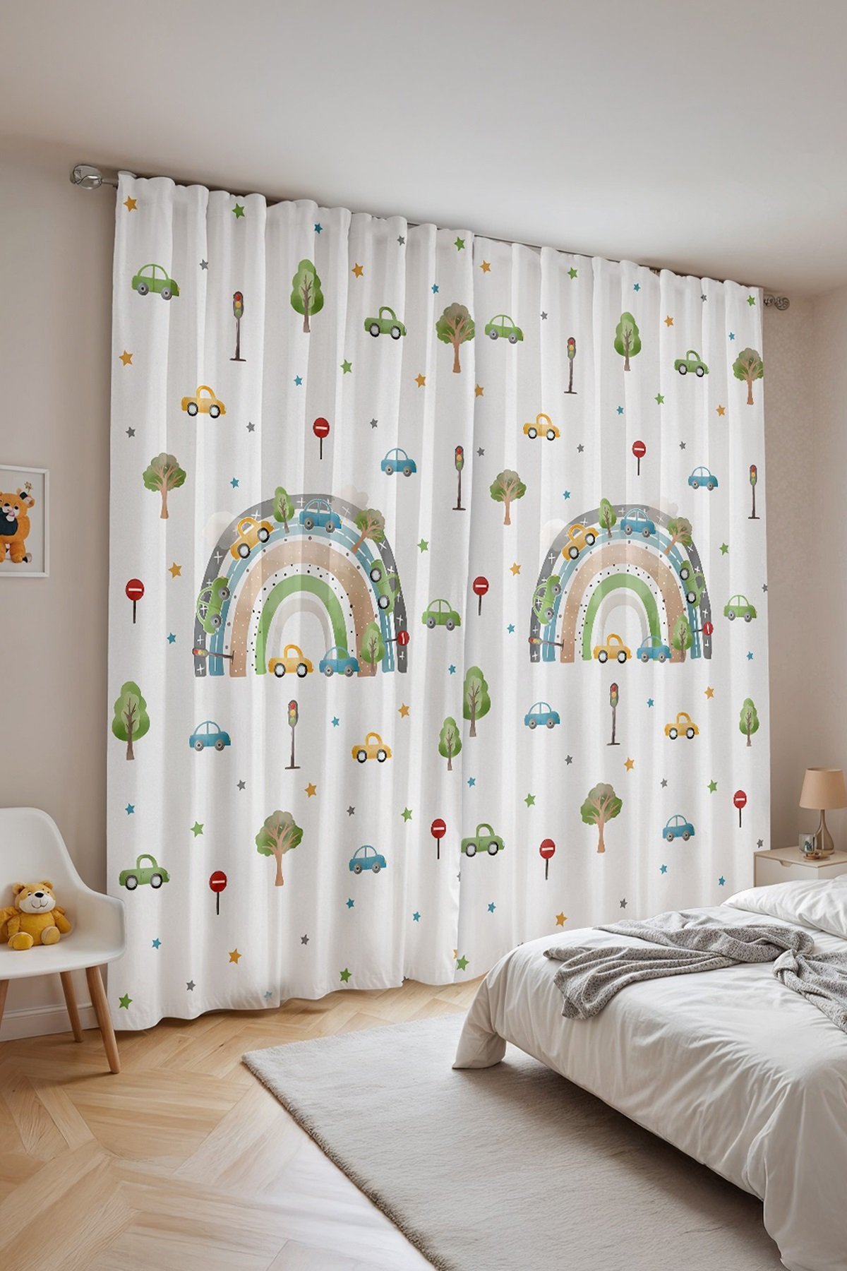 Trafik Gökkuşağı Desenli Çocuk Bebek Odası Fon Perde (Tek Kanat Fiyatlandırma)