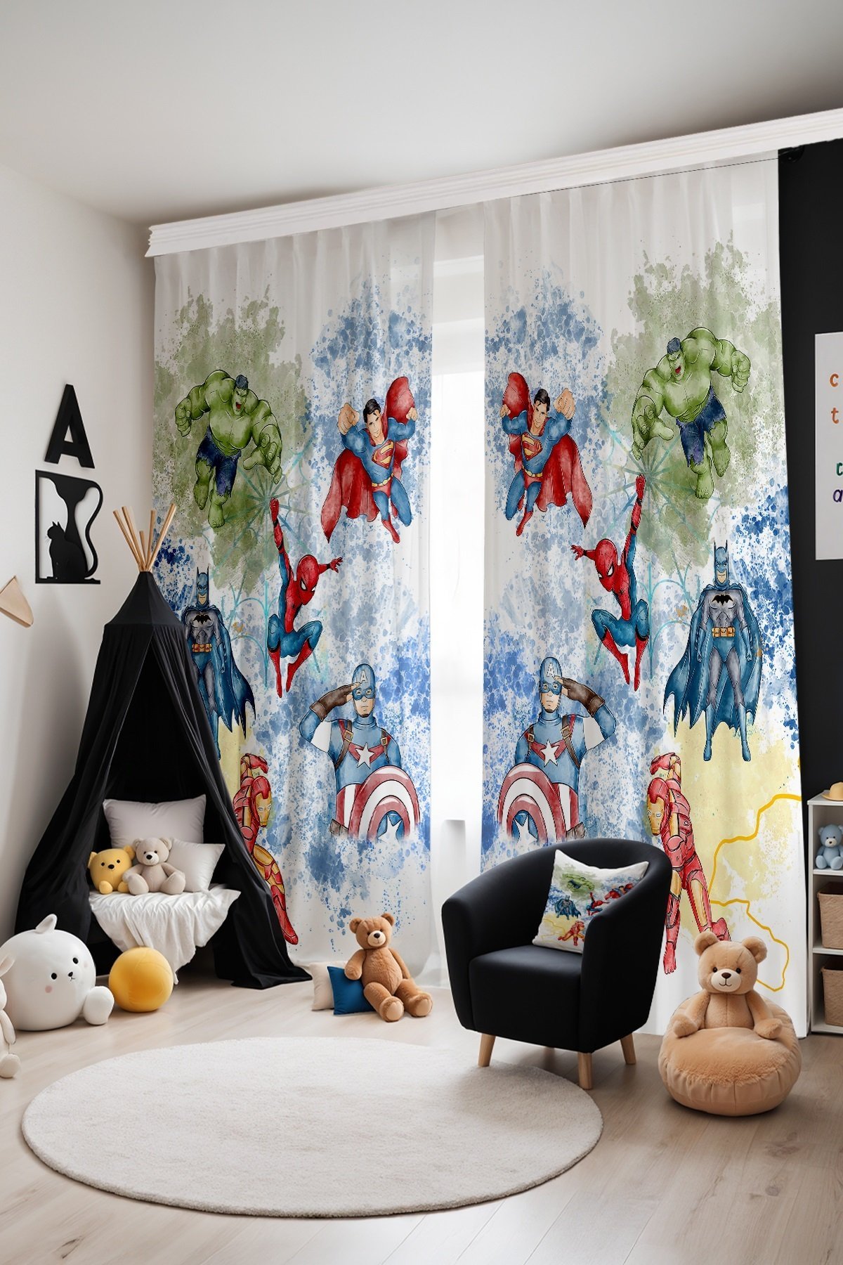 Tüm Süper Kahramanlar Desenli Çocuk Bebek Odası Fon Perde (Tek Kanat Fiyatlandırma)