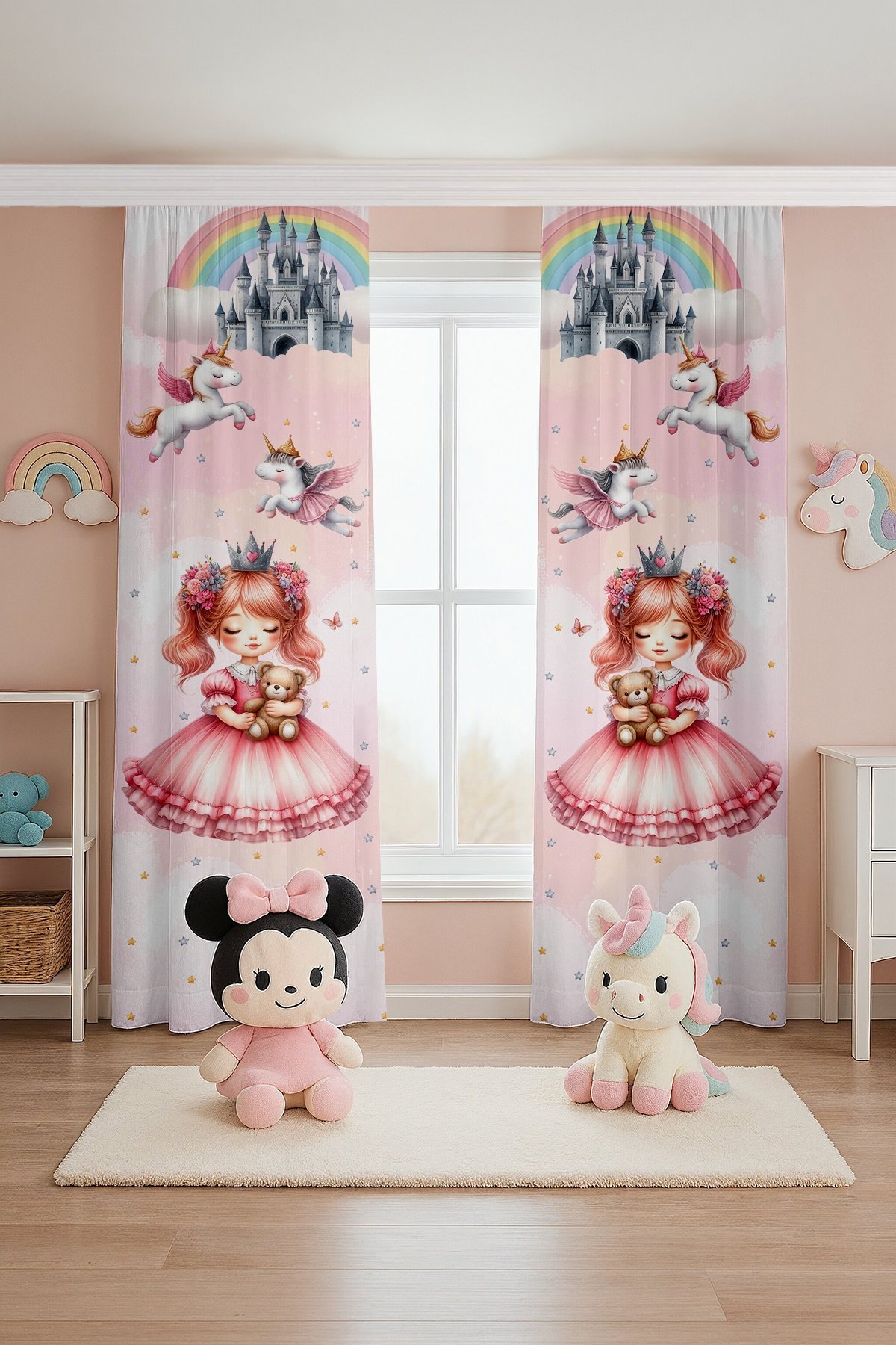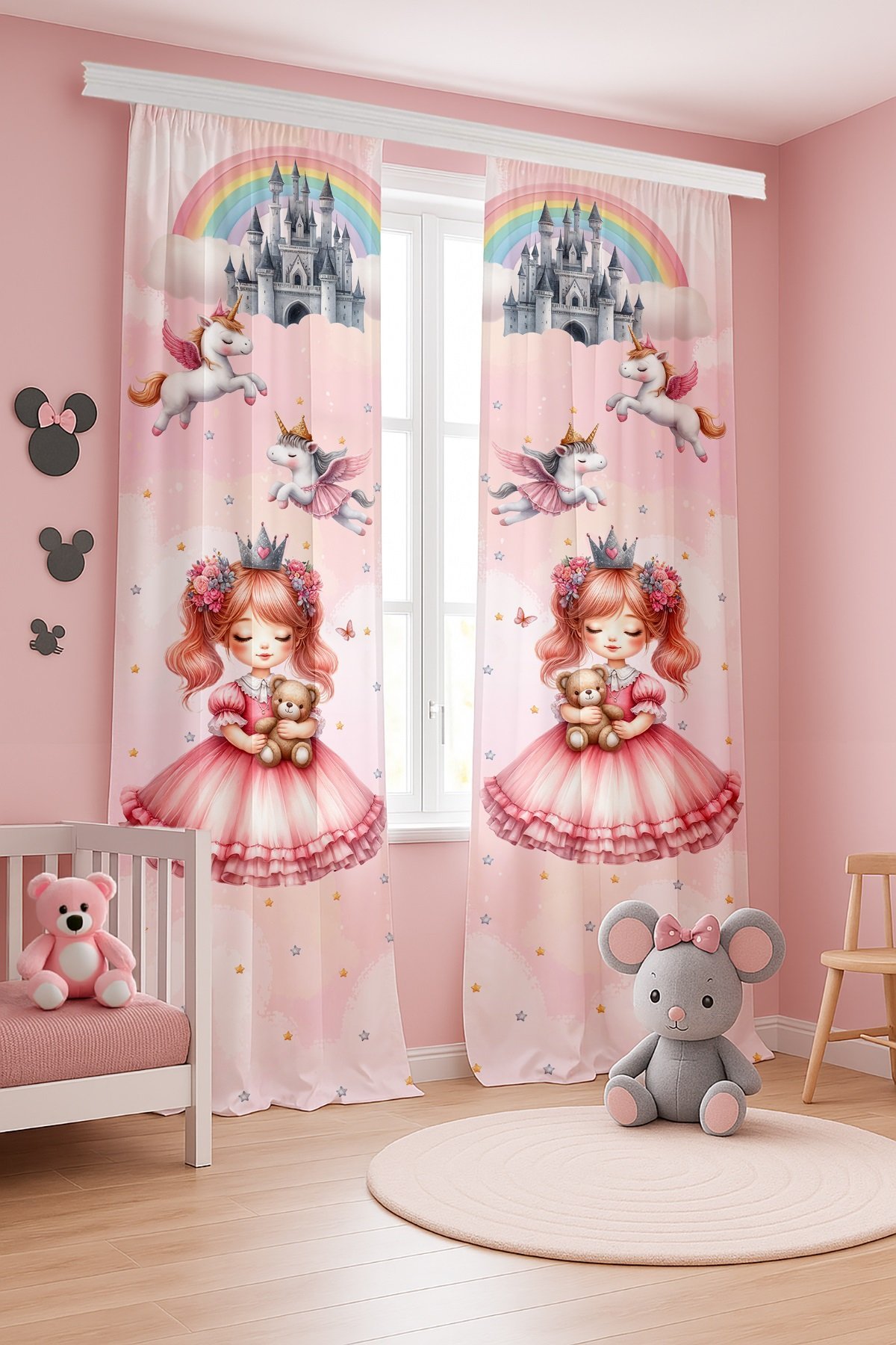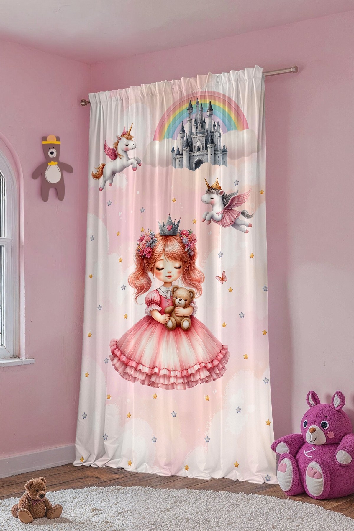 Uçan Unicornlu Prenses Desenli Çocuk Bebek Odası Fon Perde (Tek Kanat Fiyatlandırma)