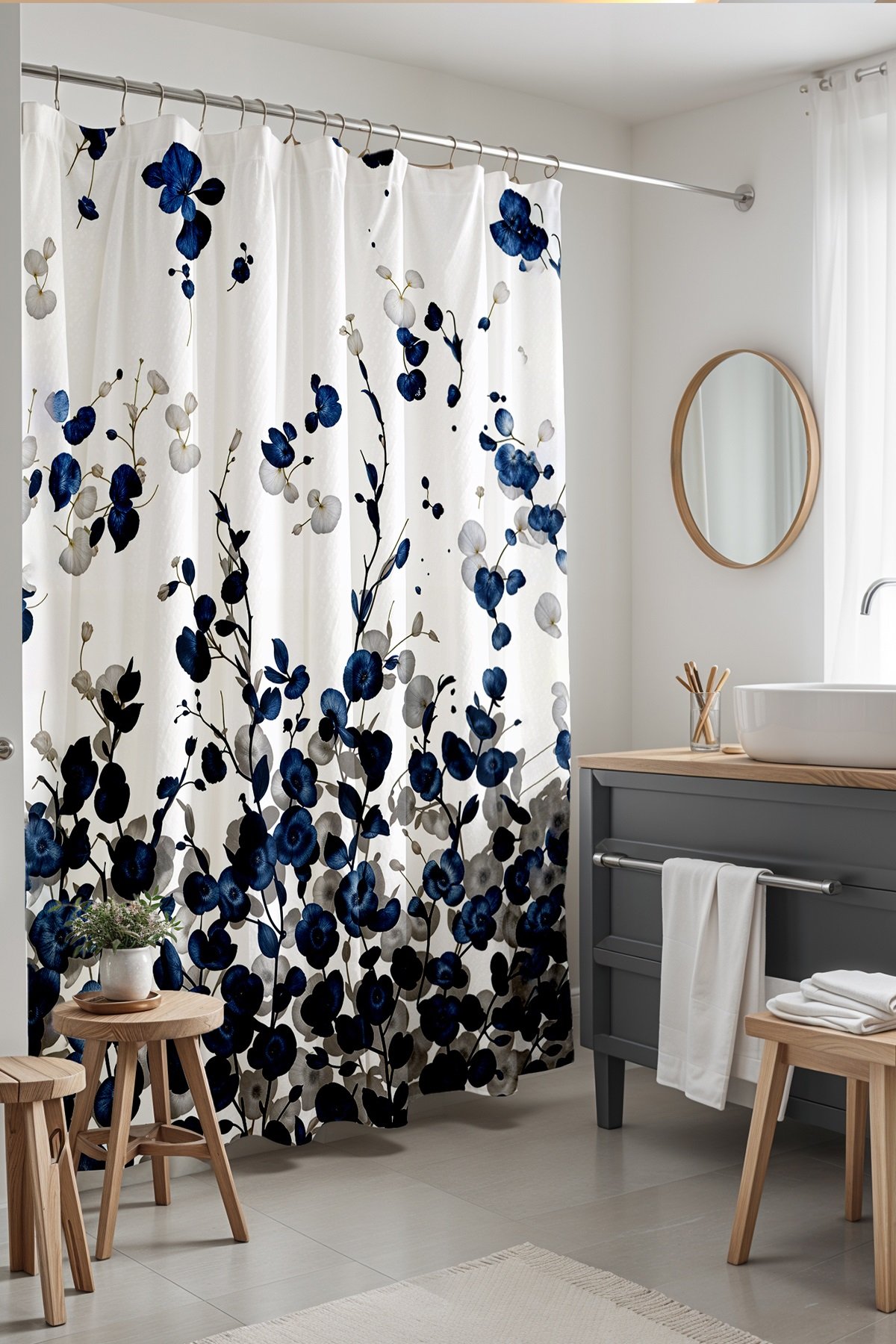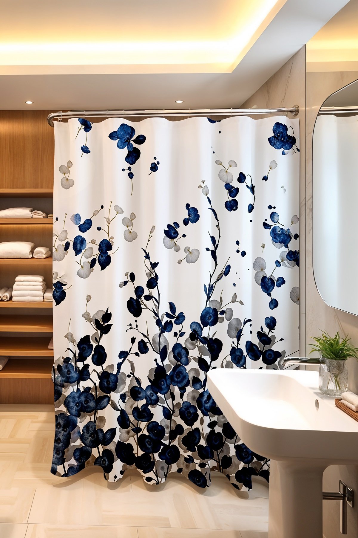 Uçuşan Lacivert Çiçekler Desenli Duş Perdesi Küvet Perdesi 175x200cm