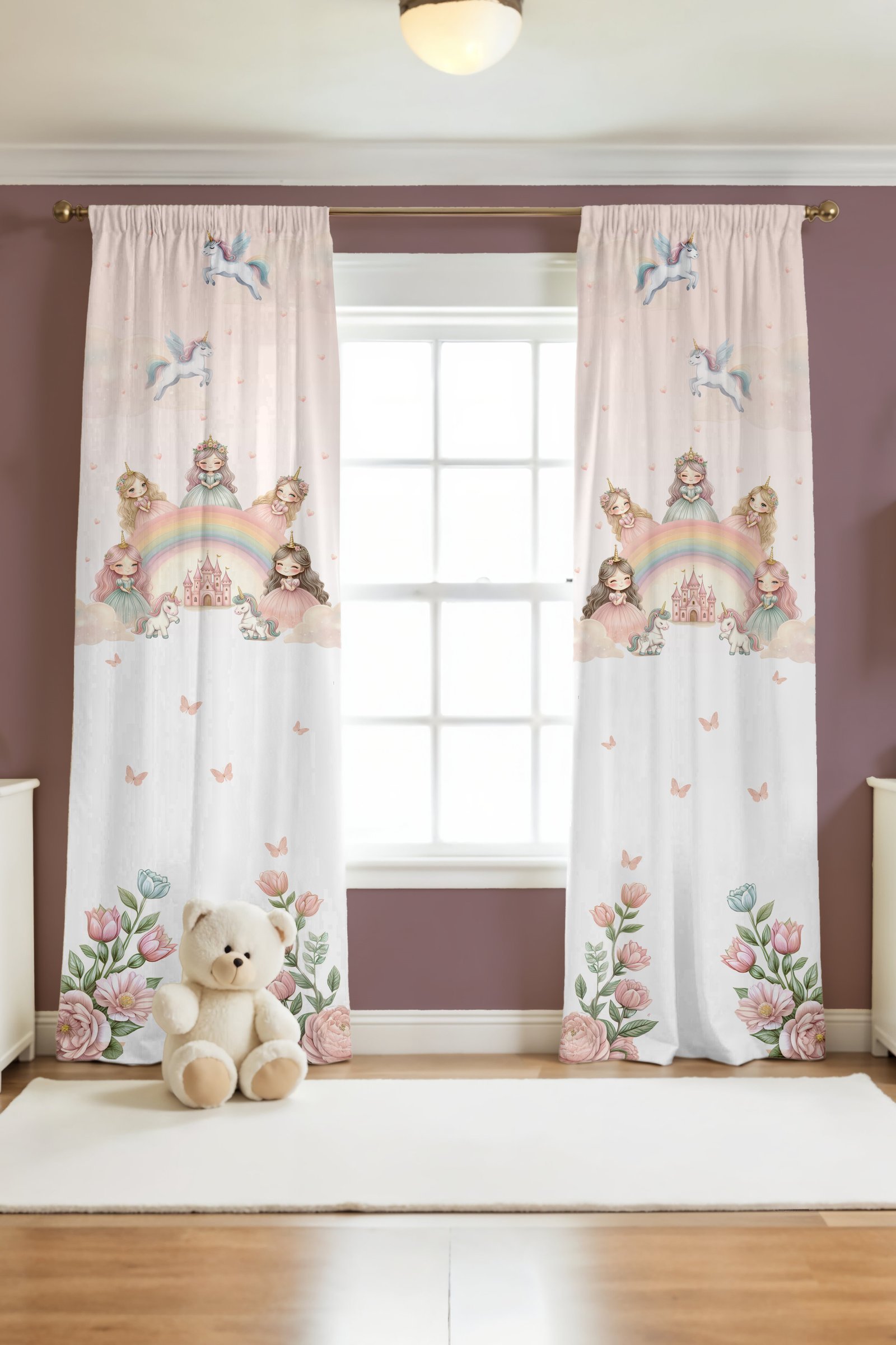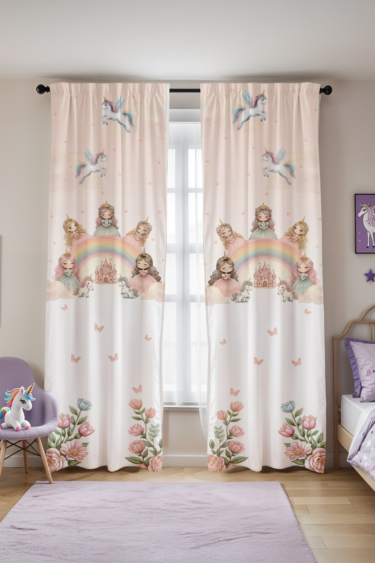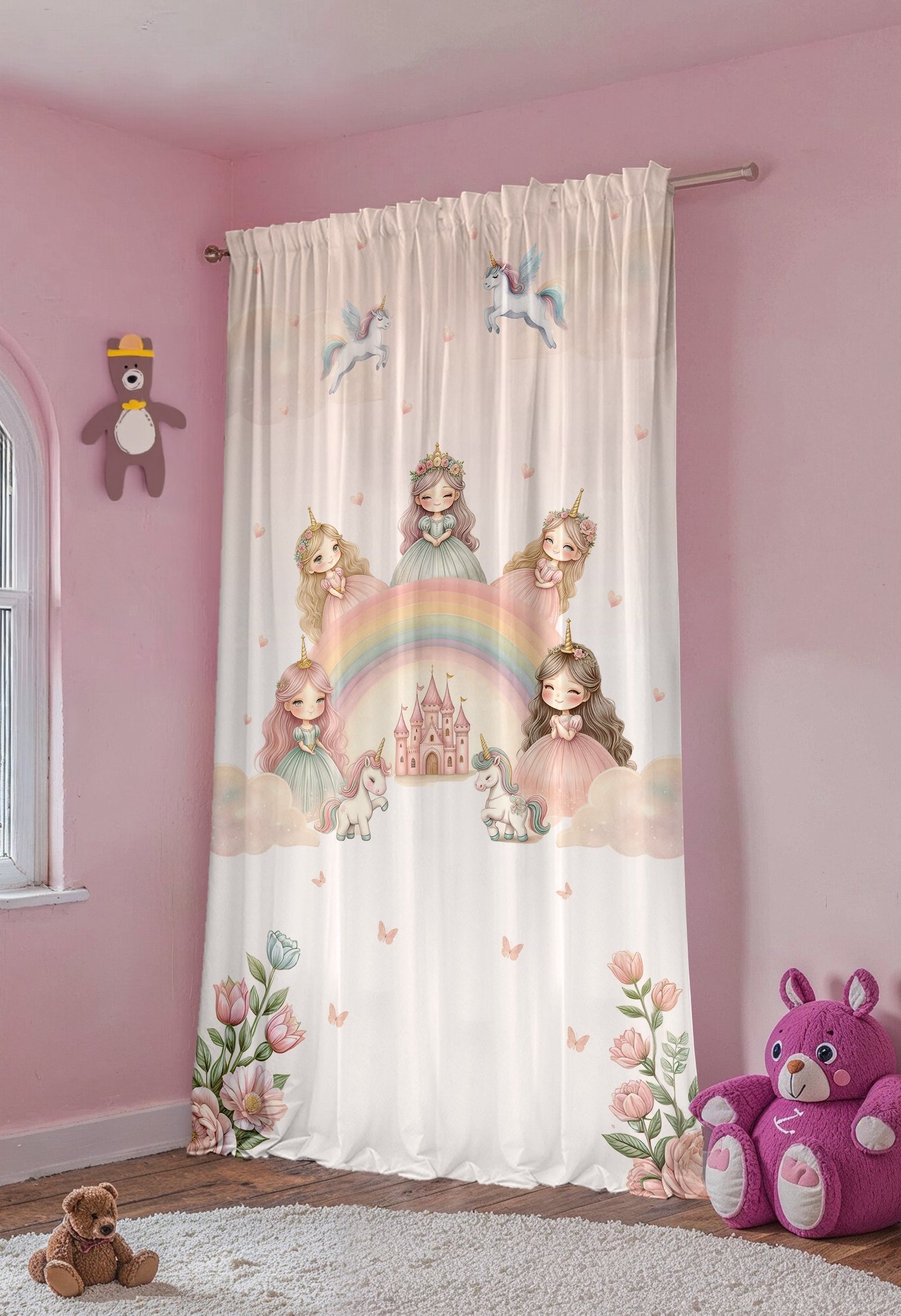 Unicornlu Pembe Kaleli Prensesler Desenli Çocuk Bebek Odası Fon Perde (Tek Kanat Fiyatlandırma)