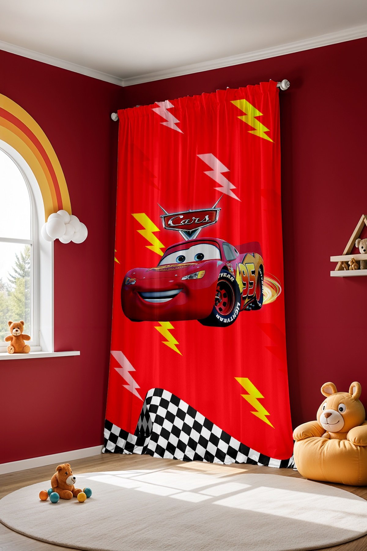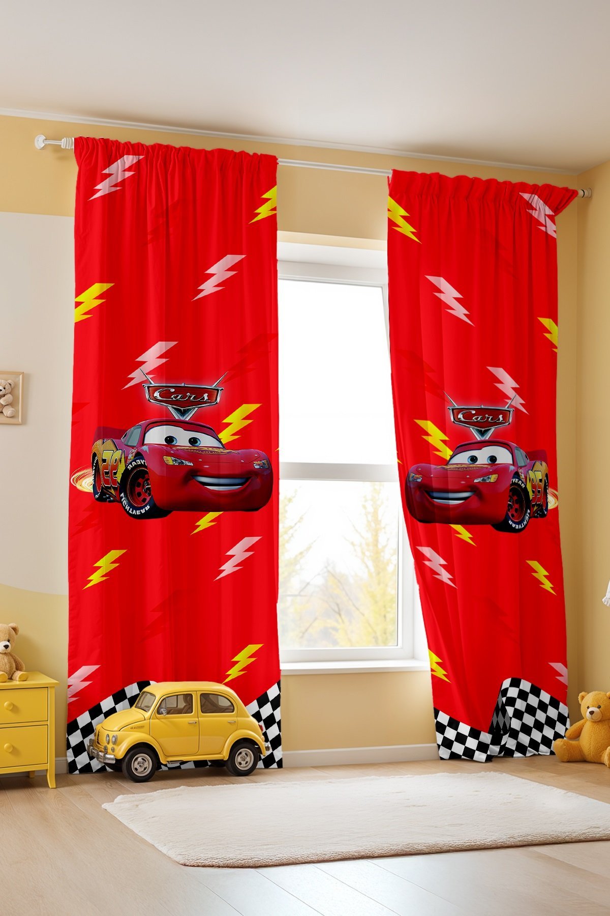 Yarışçı Kırmızı Mcqueen Desenli Çocuk Bebek Odası Fon Perde (Tek Kanat Fiyatlandırma)