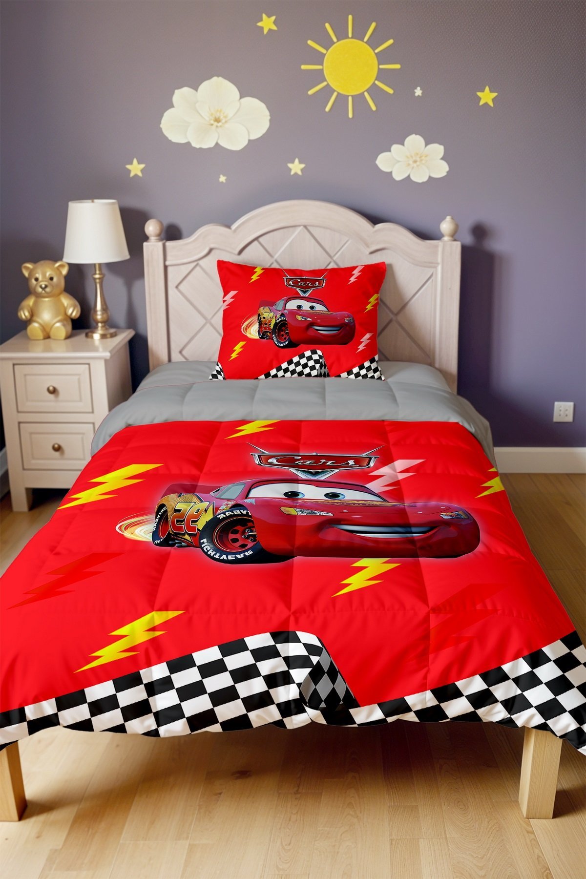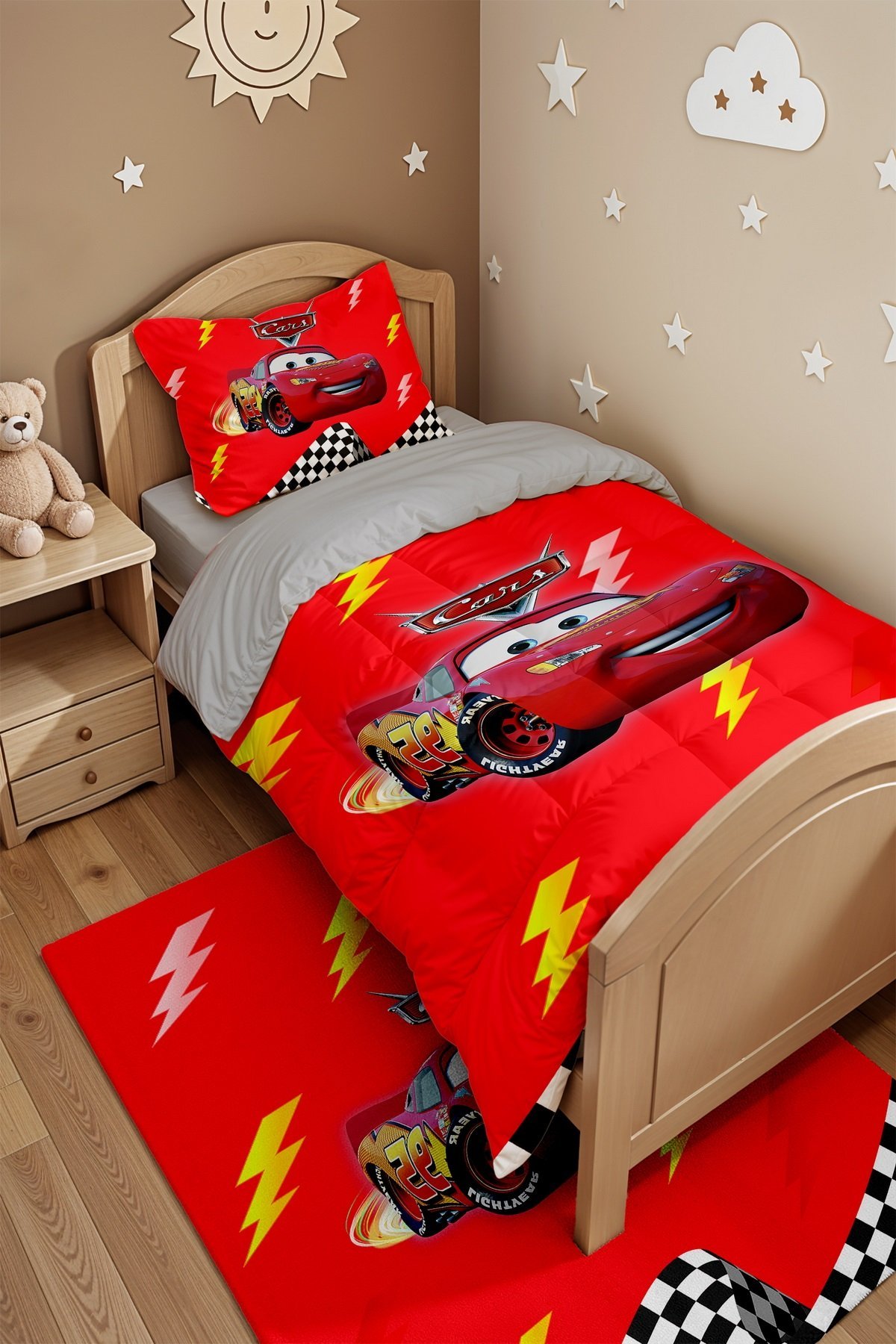 Yarışçı Kırmızı Mcqueen Desenli Tek Kişilik Yorgan ve Yastık Kılıfı