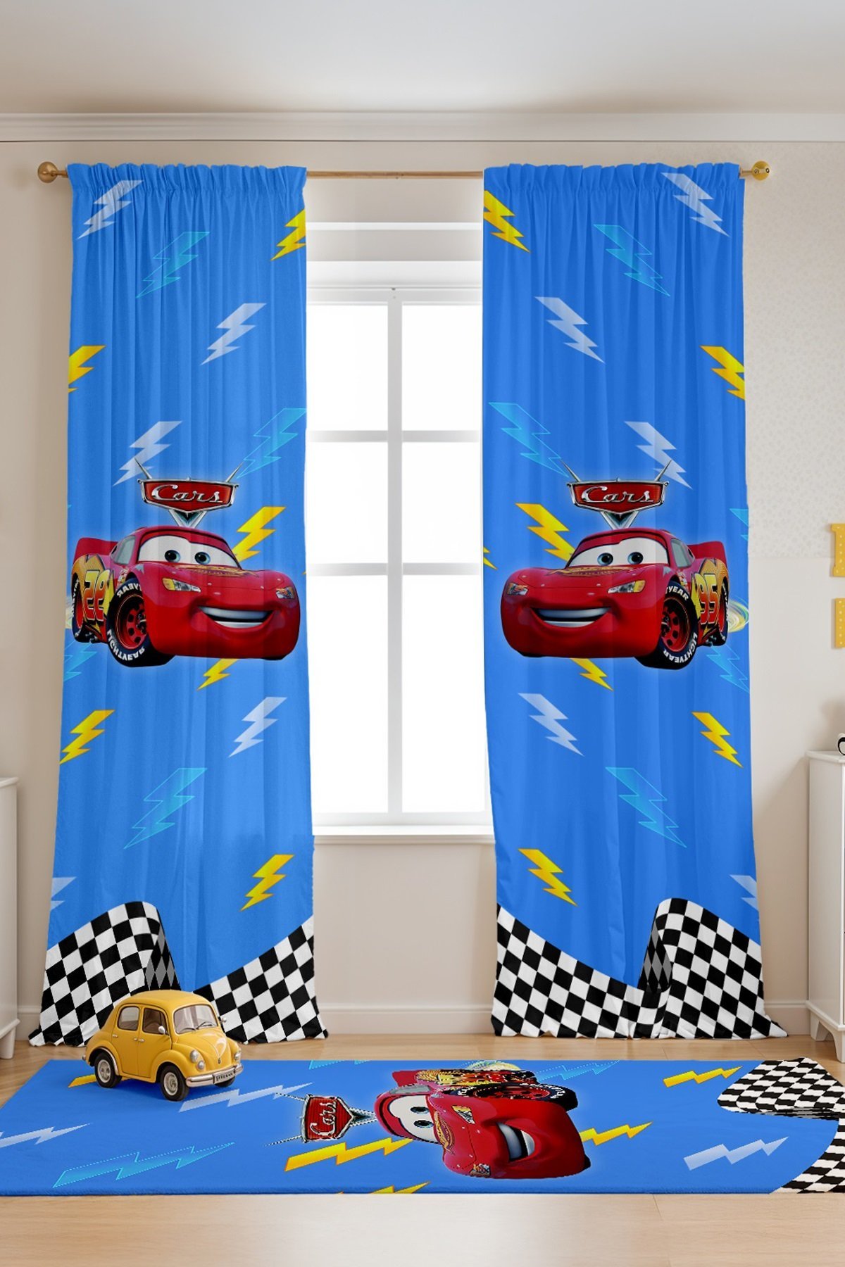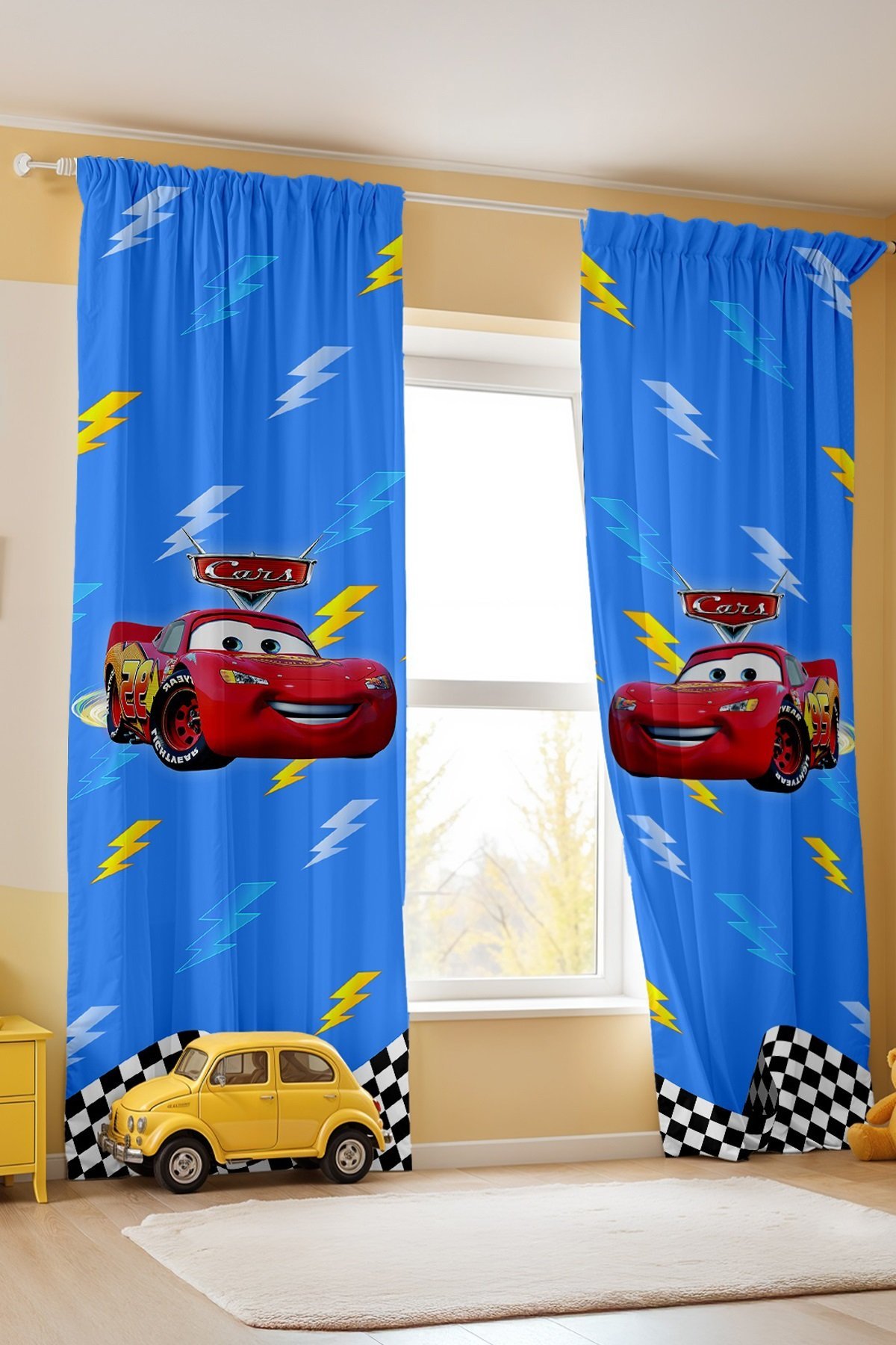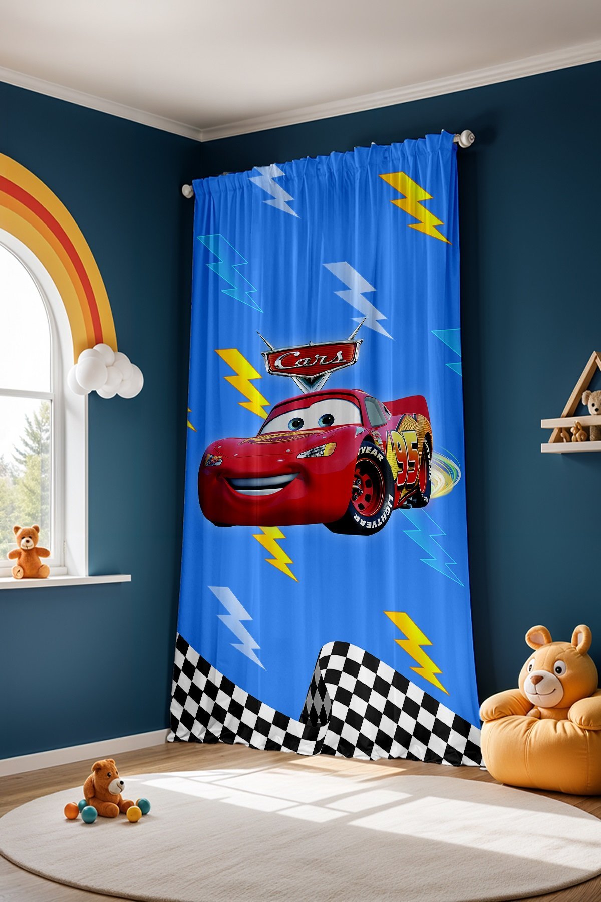 Yarışçı Mavi Mcqueen Desenli Çocuk Bebek Odası Fon Perde (Tek Kanat Fiyatlandırma)