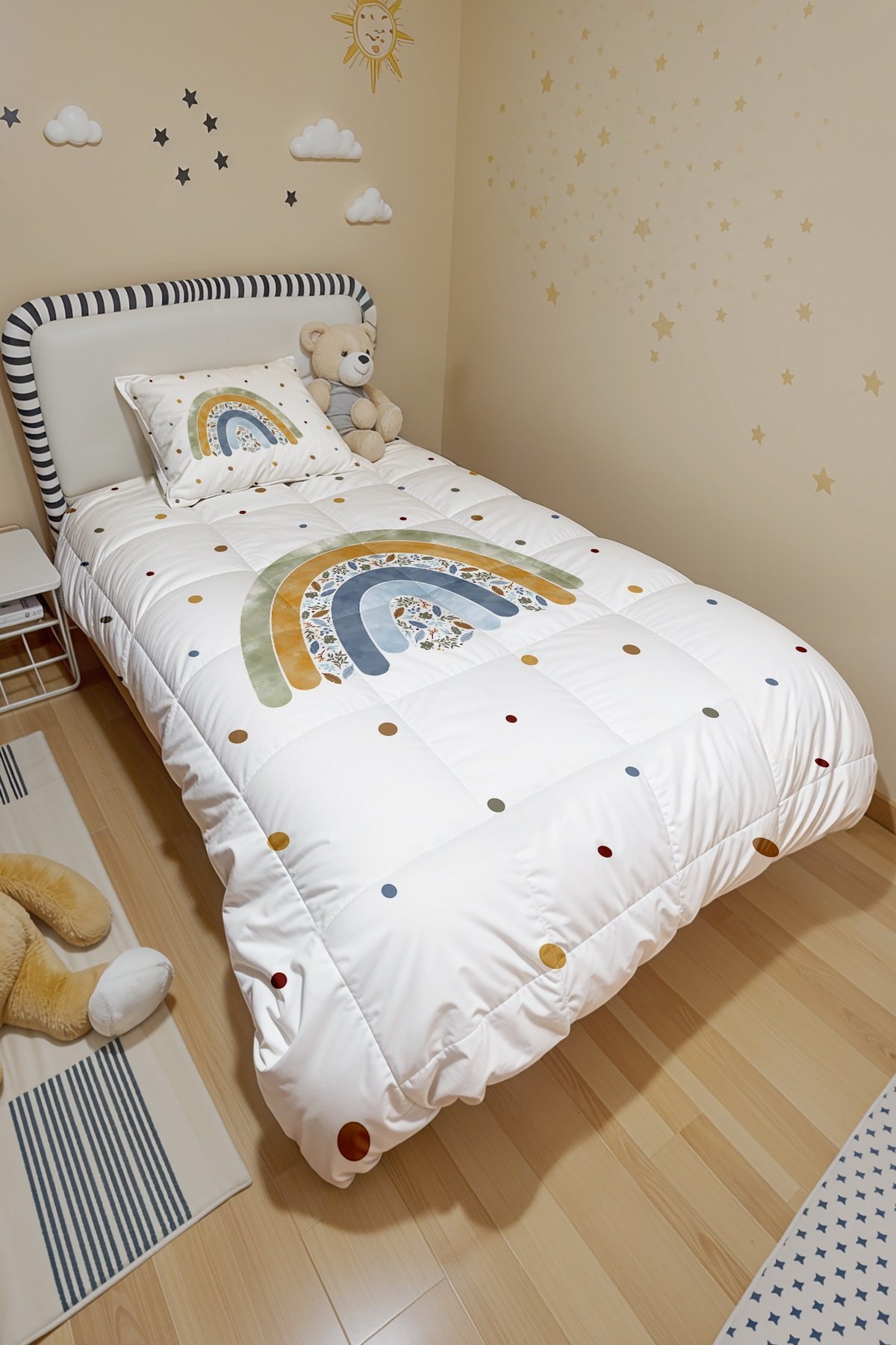 Yeşil Çiçekli Gökkuşağı Desenli Tek Kişilik Yorgan ve Yastık Kılıfı