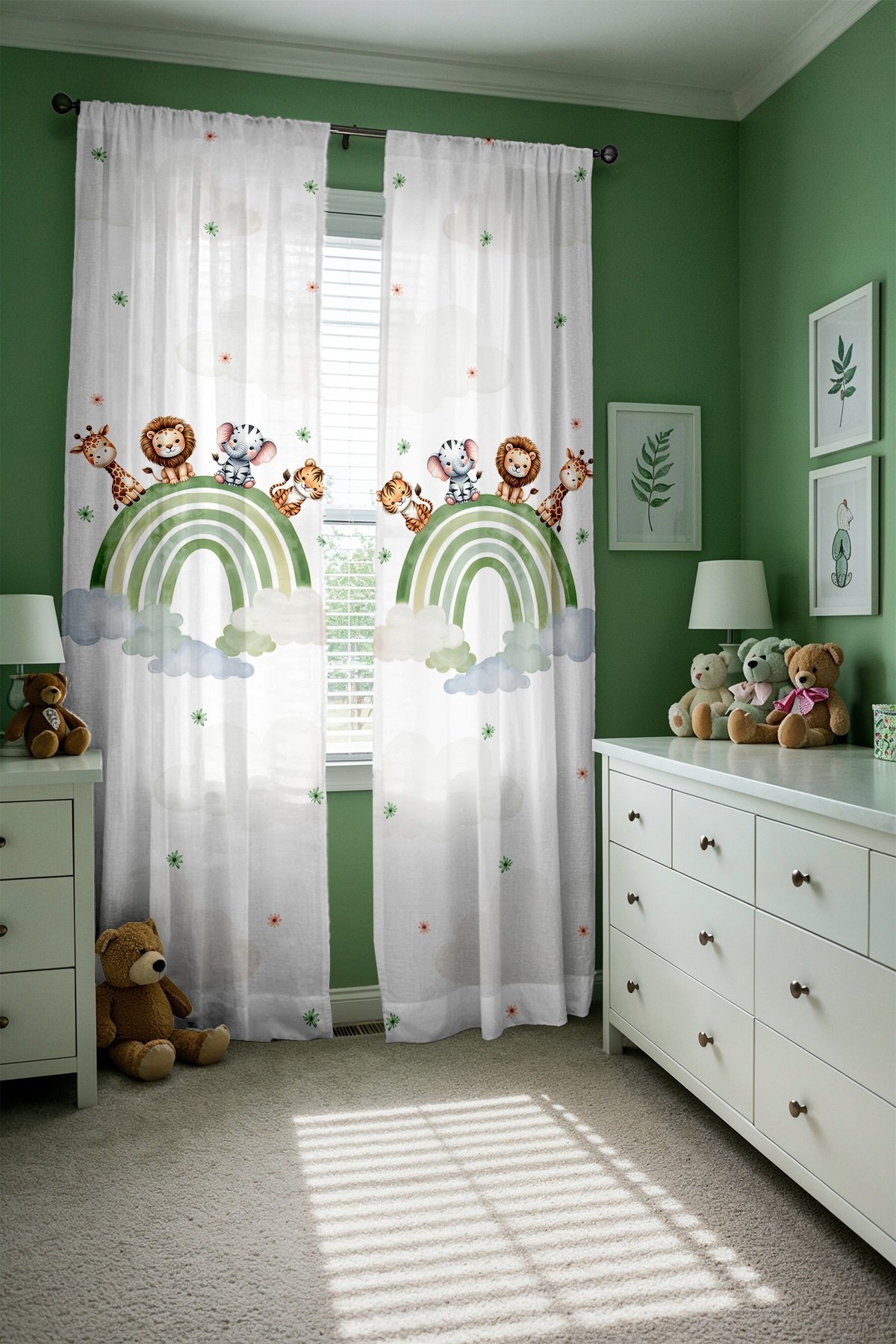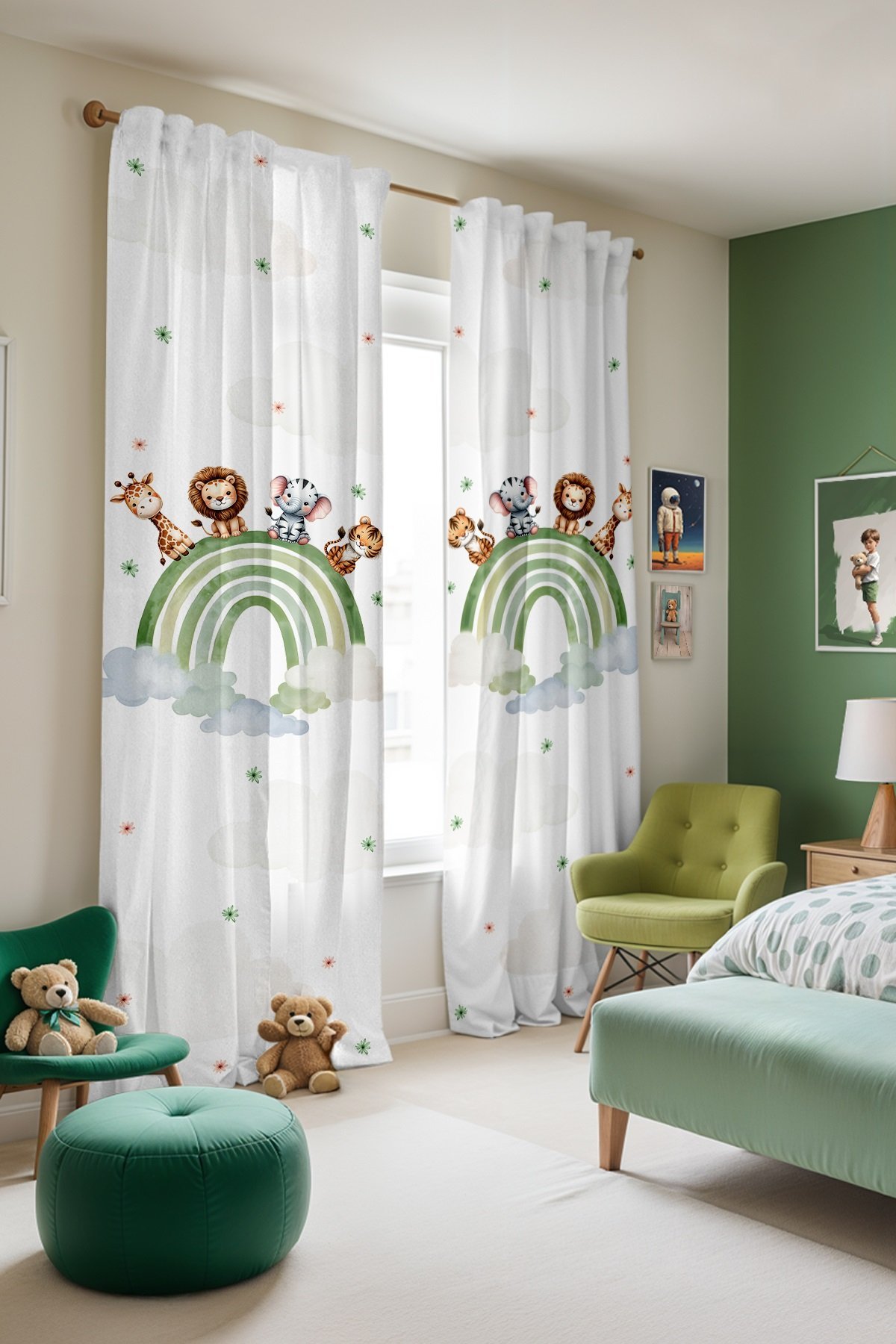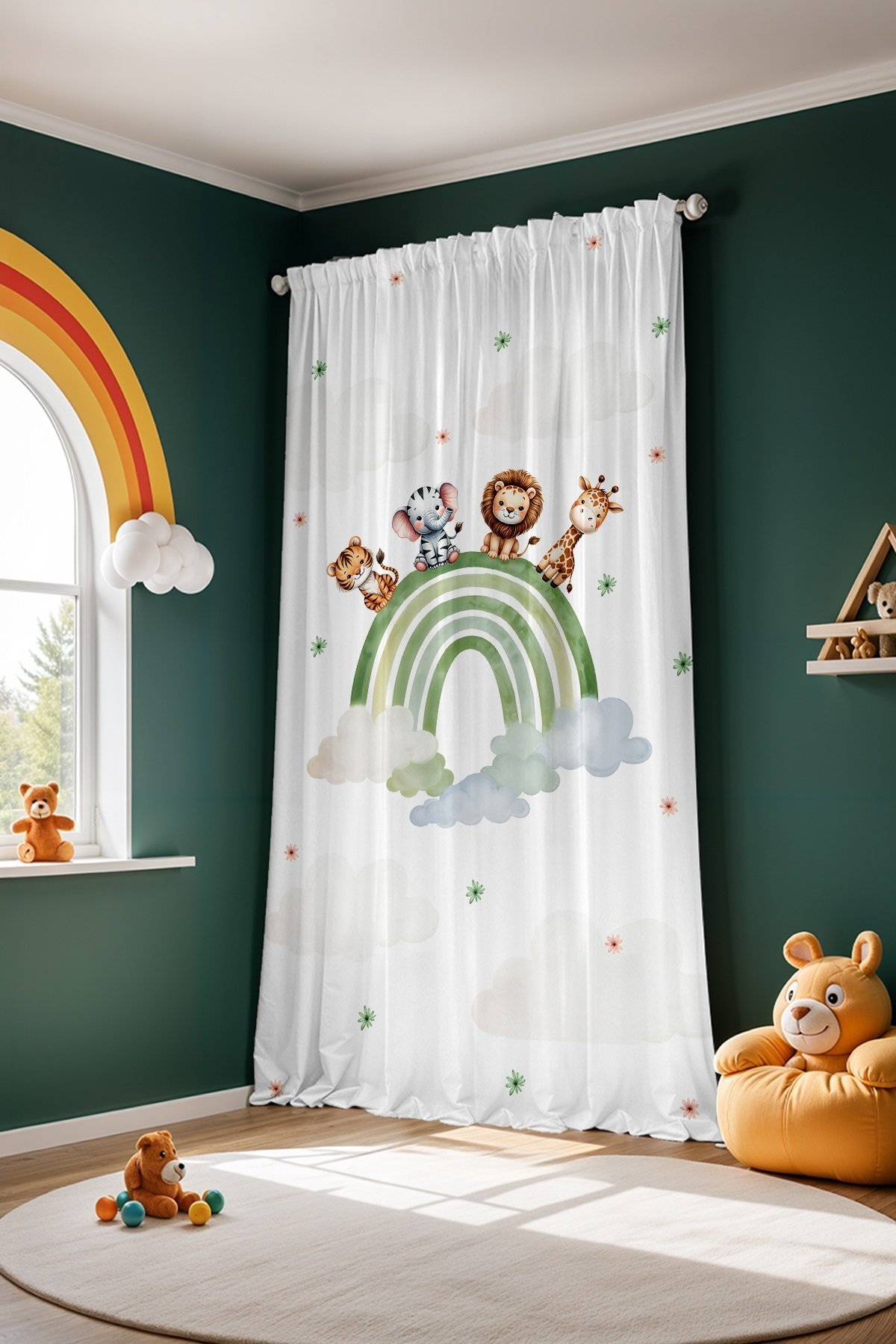 Yeşil Gökkuşağı ve Safari Desenli Çocuk Bebek Odası Fon Perde (Tek Kanat Fiyatlandırma)