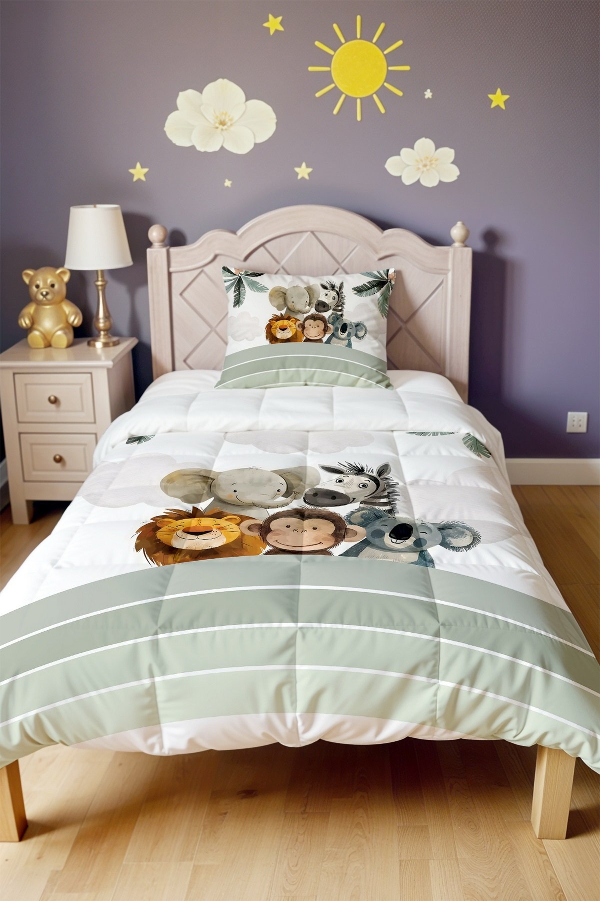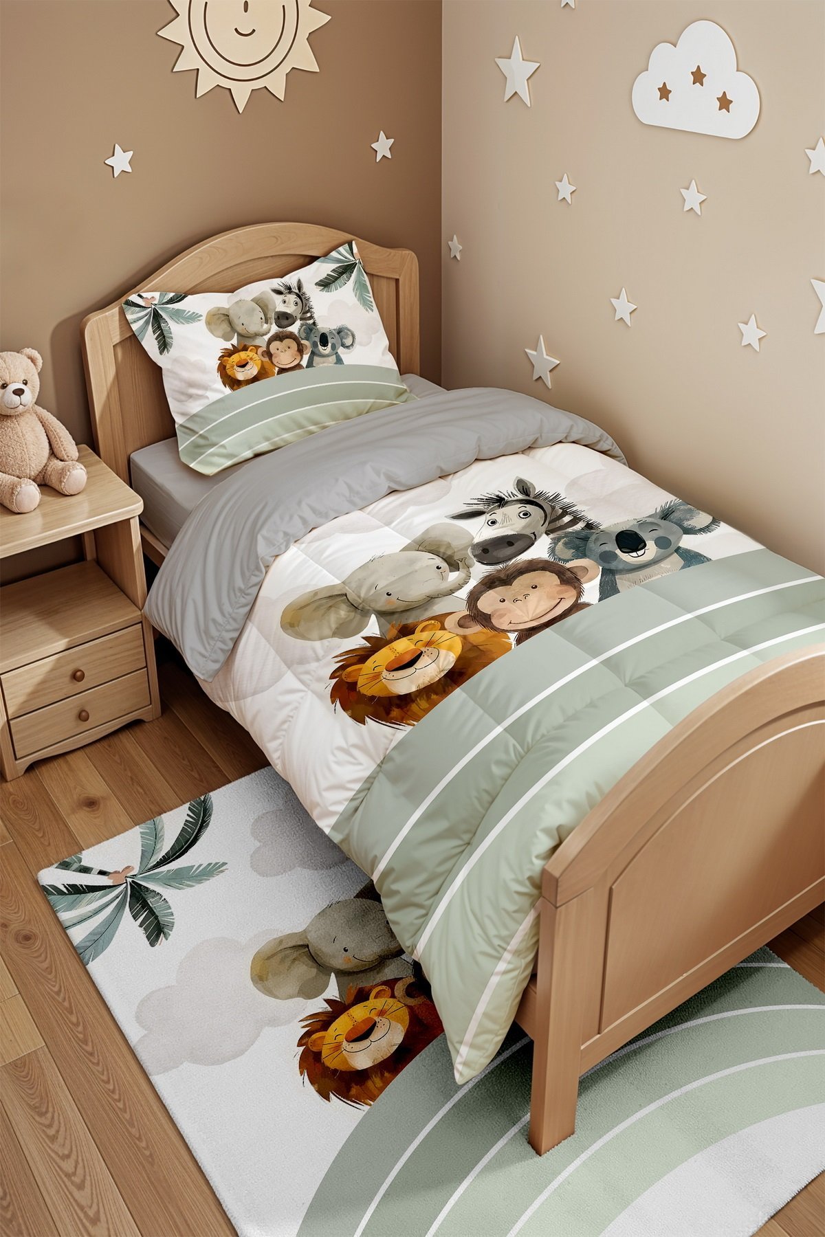 Yeşil Gökkuşağı ve Sevimli Hayvanlar Desenli Tek Kişilik Yorgan ve Yastık Kılıfı