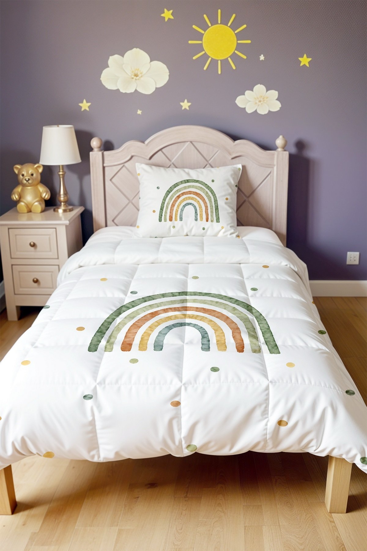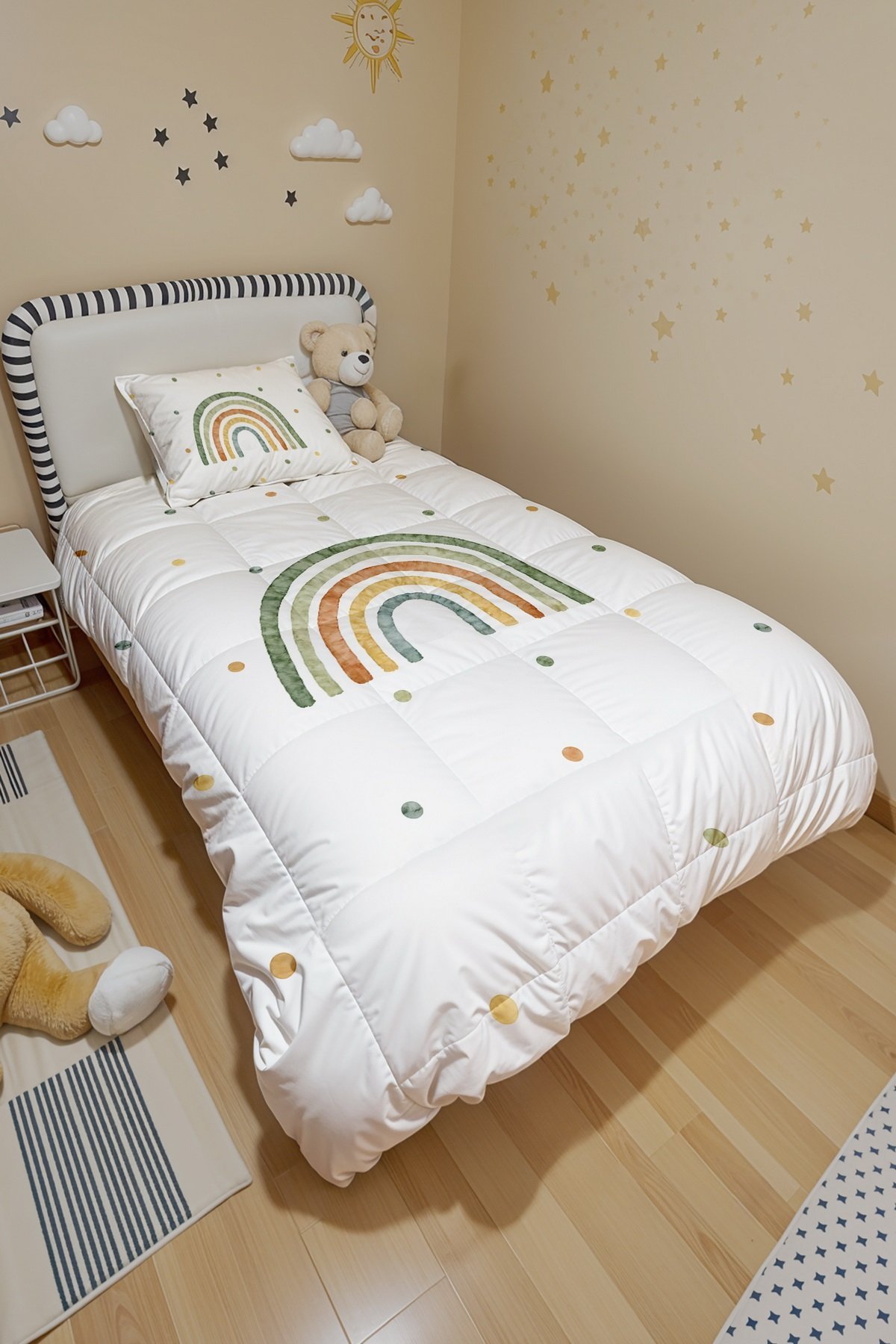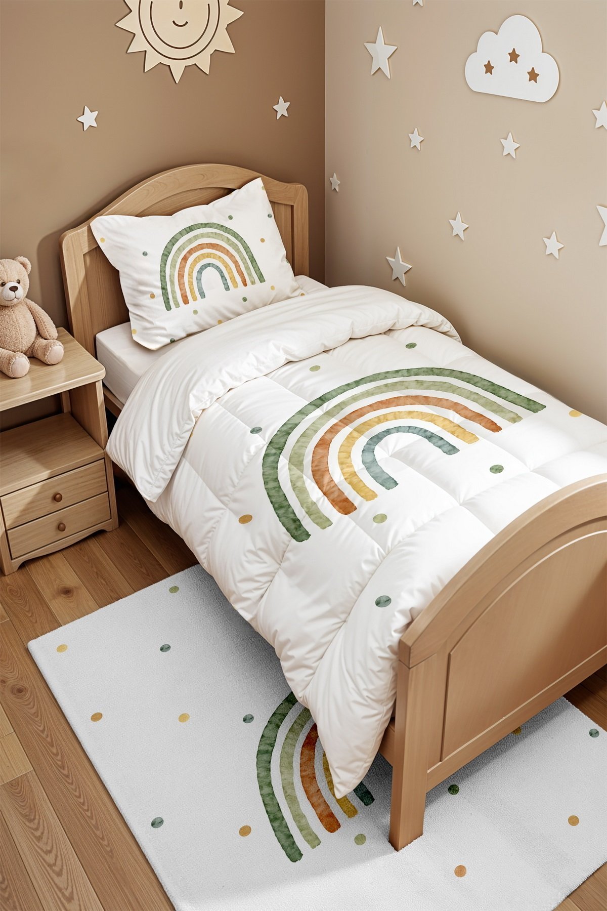 Yeşilli Gökkuşağı Desenli Tek Kişilik Yorgan ve Yastık Kılıfı
